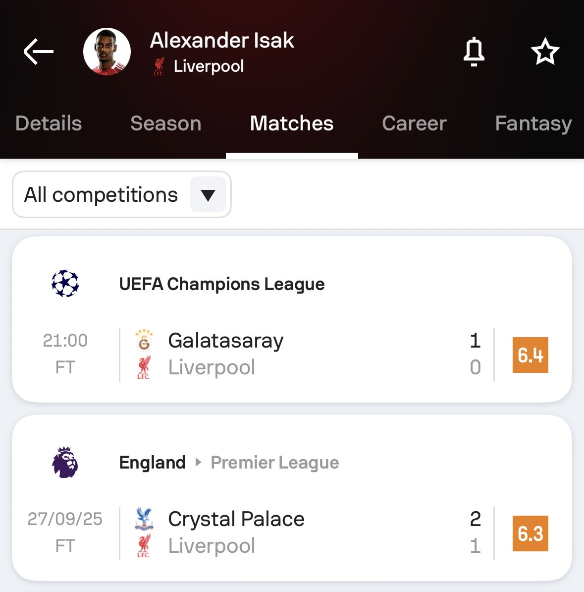 在利物浦对阵水晶宫和加拉塔萨雷的两场失利中,伊萨克一共出场了112分钟,但他没有获得太多发挥的机会,一共只在对方禁区内完成4次触球。