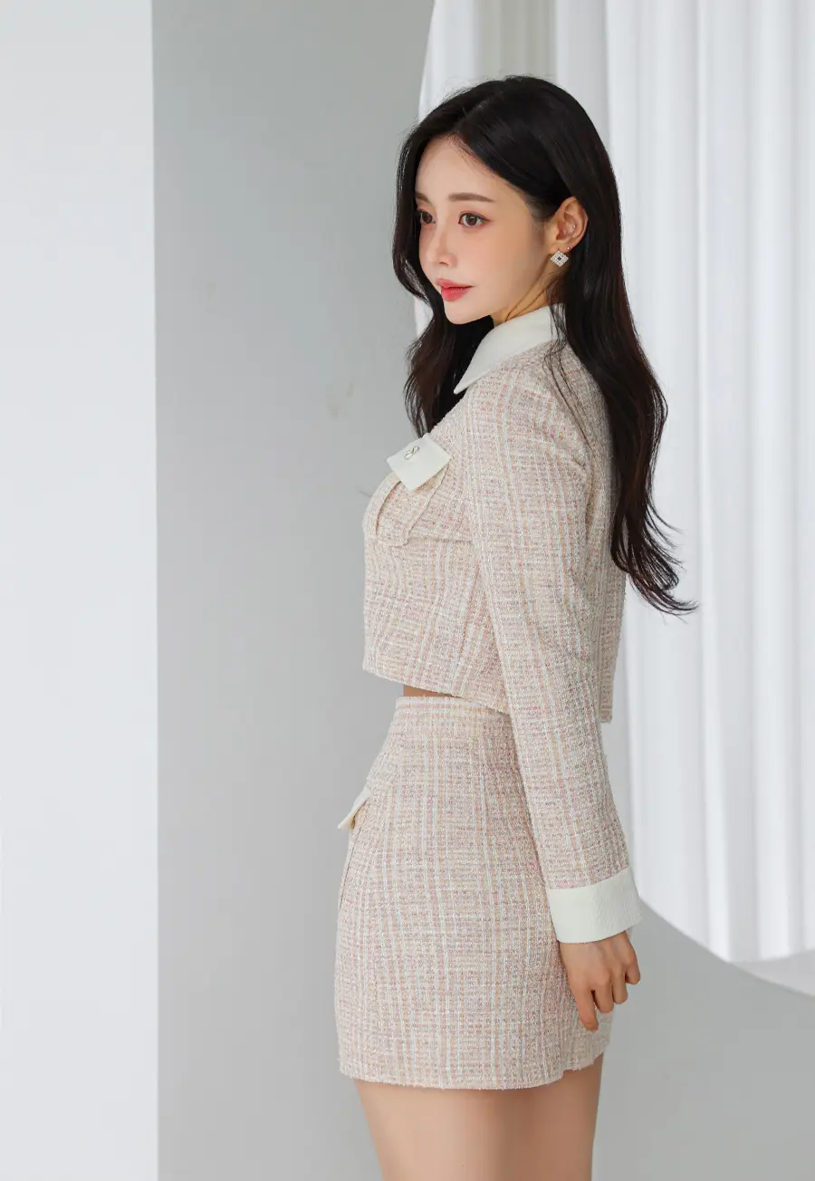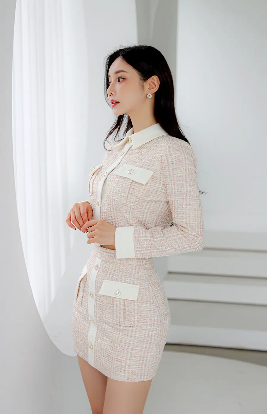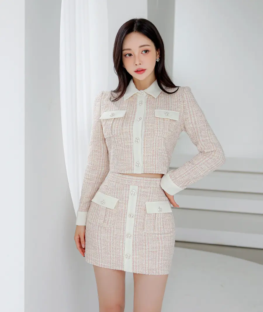 孙允珠短款翻领口袋外套搭配小香风短裙孙允珠短款翻领口袋外套搭配小...