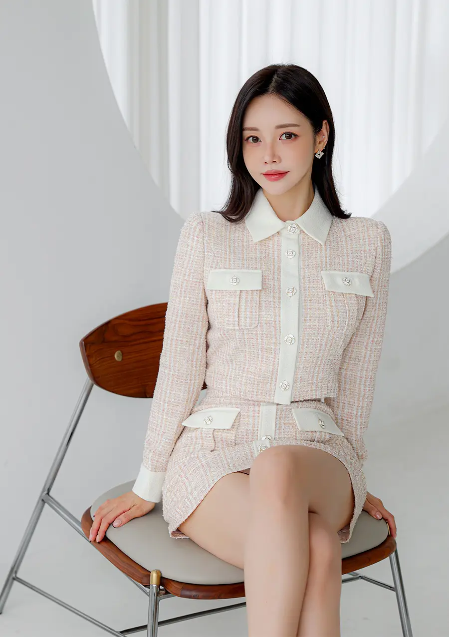 孙允珠 短款翻领口袋外套搭配小香风短裙 孙允珠 短款翻领口袋外套搭配小香风短裙,妥妥的都市丽人