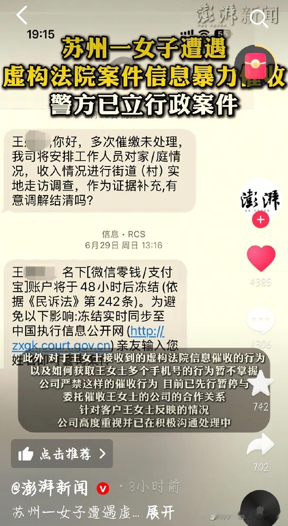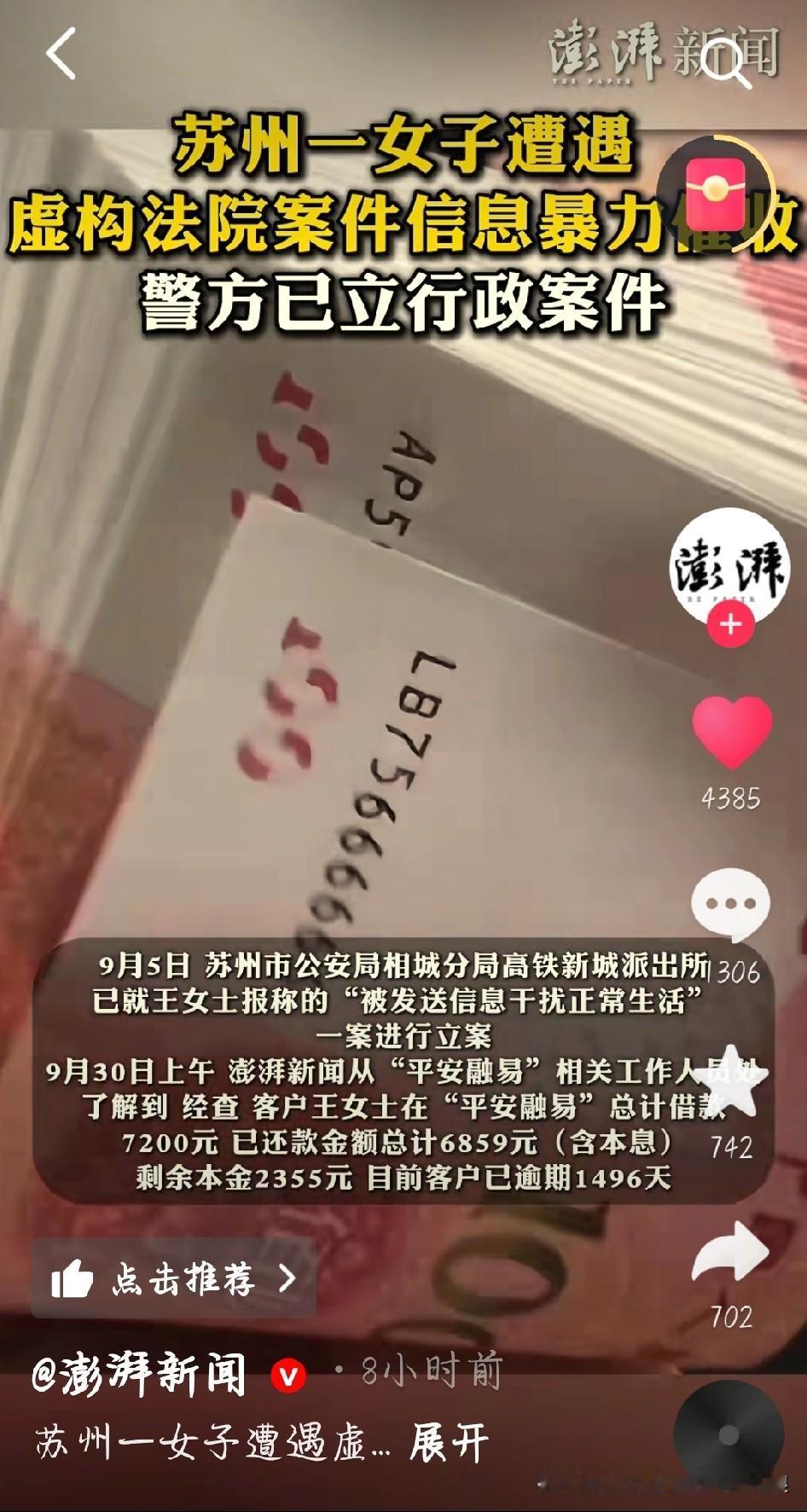 苏州王女士的遭遇太气人:欠“平安融易”几千块,5个手机号全被催收盯上,还收到带虚假法院案号的短信,威胁要限高出行。 更离谱的是,新办的、宽带赠送的号码对方都知道,信息咋泄露的还是谜。核实后发现,所谓的法院立案号压根不存在,纯是催收伪造的唬人套路。 现在警方已立案,涉事催收合作也被暂停。这哪是催债,是借着公检法的名头敲诈!还好王女士没慌着给钱,提醒大家:收到这类信息先查法院官网,别被套路吓住,直接报警才是对的!暴力催收 债务催收 贷款催收 债务催收公司 网贷公司恐吓 非法债务催收