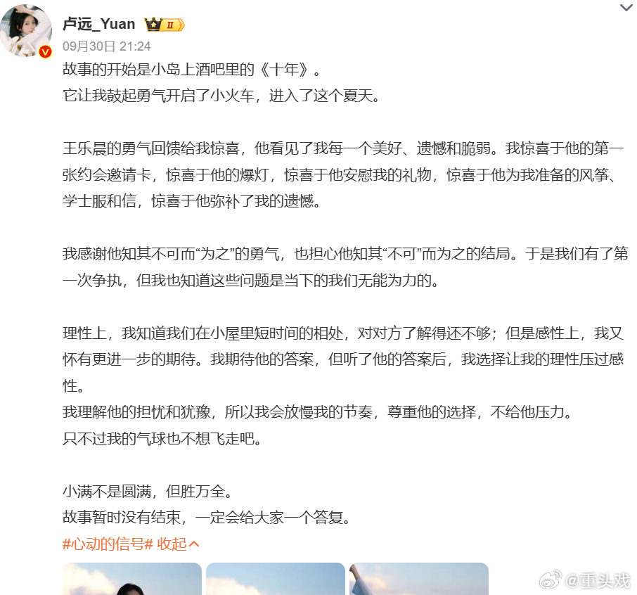 乐远cp选择不成为情侣 《心动的信号》王乐晨卢远在最终选择环节选择不成为情侣。二人节目播出后也在微博发文回应。