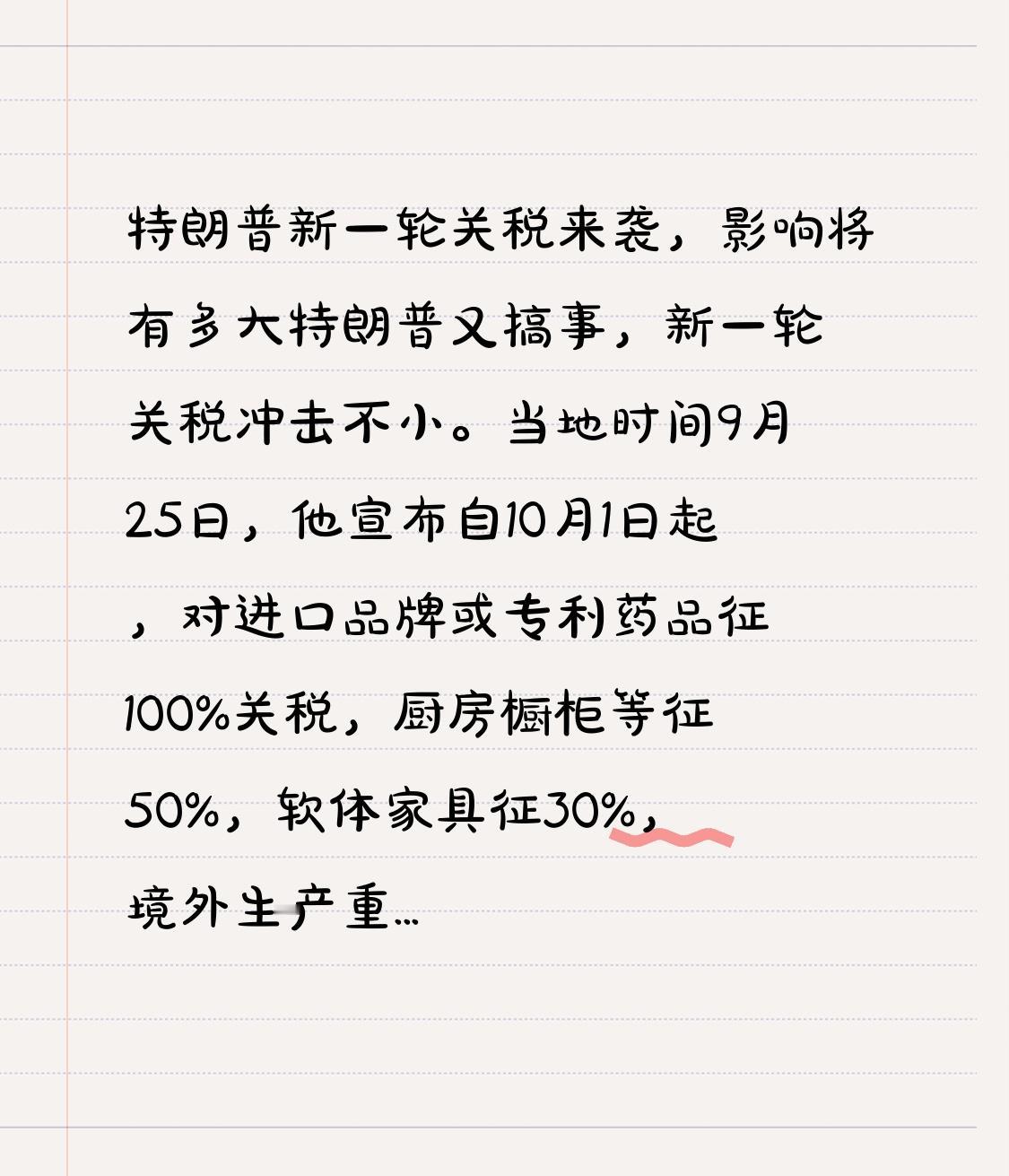 特朗普新一轮关税来袭,影响将有多大 特朗普又搞事,新一轮关税冲击不小。当地时间9月25日,他宣布自10月1日起,对进口品牌或专利药品征100%关税,厨房橱柜等征50%,软体家具征30%,境外生产重型卡车征25%。 这一举措迅速波及各领域。制药行业股价率先承压,丹麦诺和诺德、英国葛兰素史克等公司股价下跌,澳大利亚杰特公司股价跌至六年新低。新关税可能影响医疗、住房、物流等经济领域,人们担忧药价上涨和药品短缺。彭博社称,品牌药品关税或使美国平均关税税率提高3.3个百分点。特朗普这波操作,无疑给全球经济又添了把火。