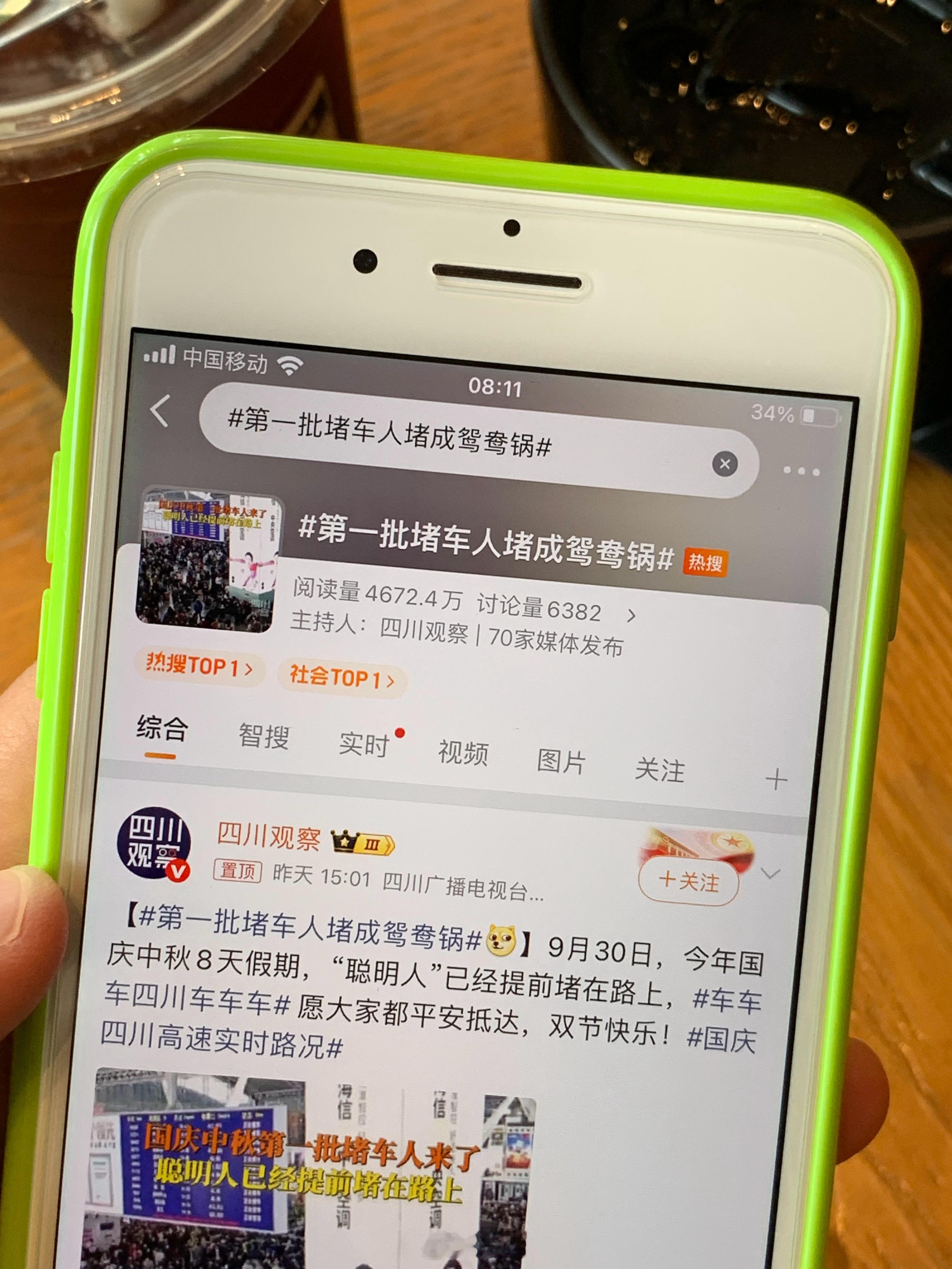 国庆也要早睡早起刷微博看好看的小姐姐研究home键iPhone。第一批堵车人堵成鸳鸯锅 ​​​