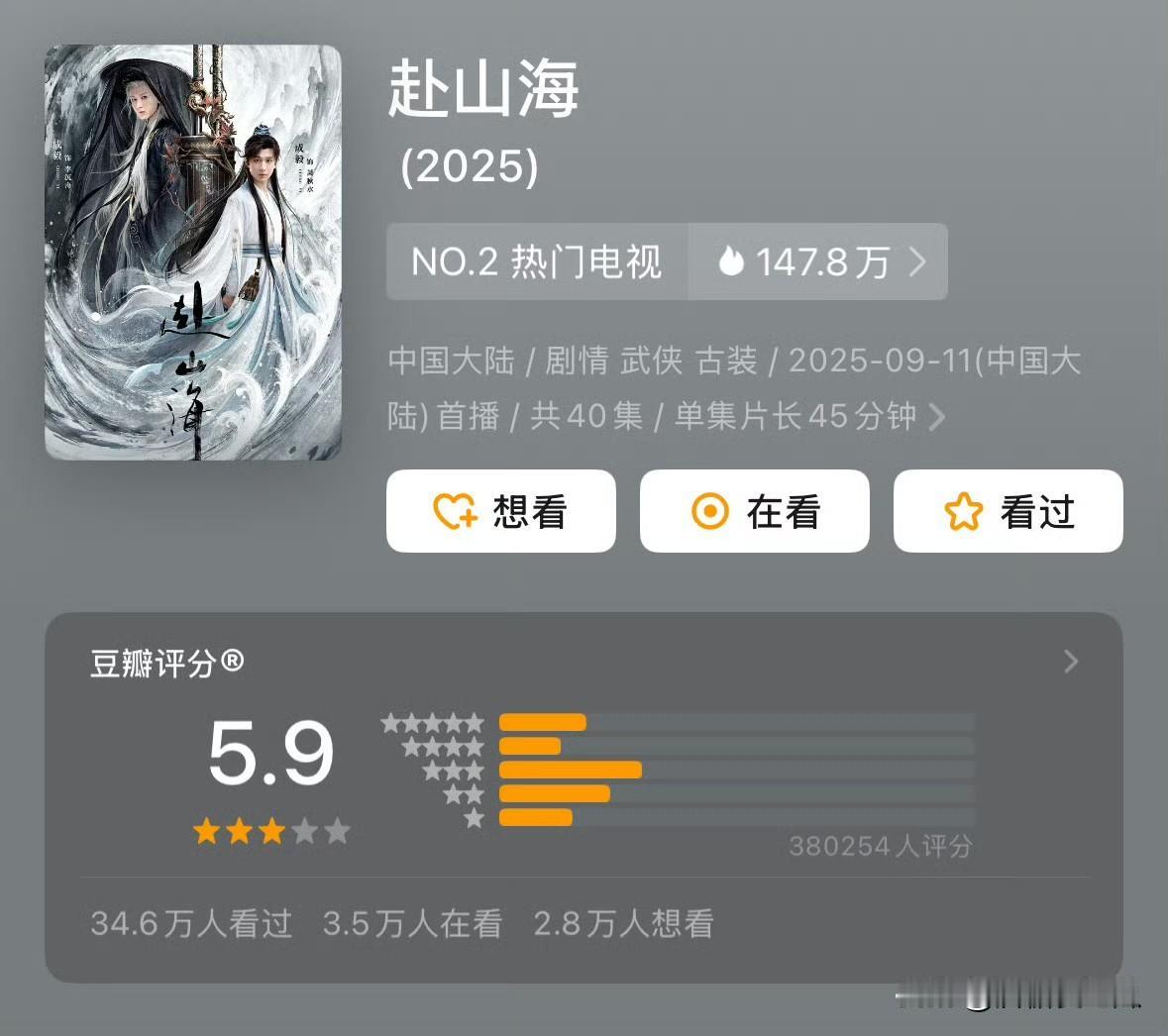 赴山海导演懵了 成毅也懵了 他们想到过会被骂,但是没想到赴山海豆瓣评分这么低,也就是说成毅这两年白干了,成毅35岁了,颜值花期短,他还在古偶里打转不求突破的话,很有可能就要资源下降退出顶流圈了。 《长安二十四计》也是大男主剧,期待能够有所突破,不然后面的资源啥的就真的很难说了。