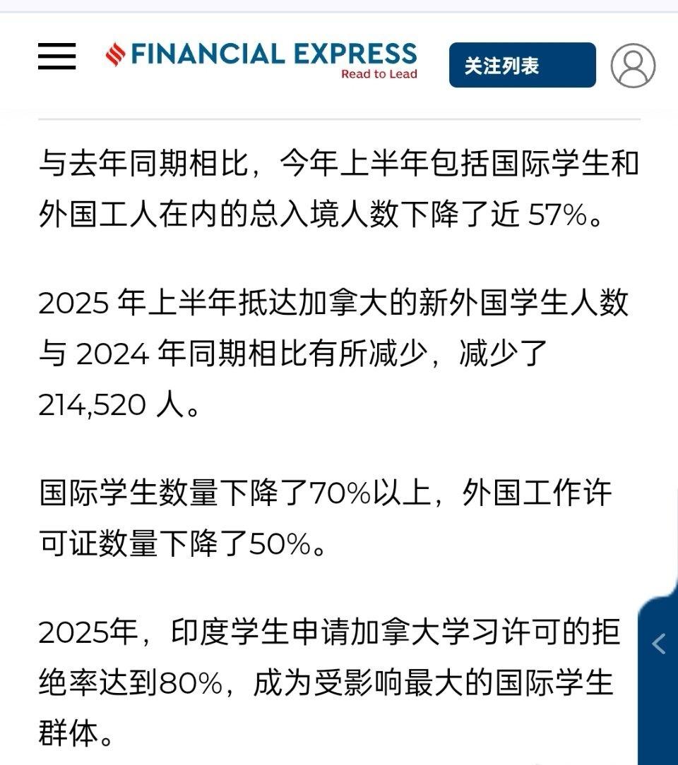 加拿大签证规定收紧导致外国学生和工人数量减少。2025年,印度学生申请加拿大学习许可的拒绝率达到80%,成为受影响最大的国际学生群体。加拿大2025-2027年移民水平计划旨在将加拿大的临时人口减少到5%以下。