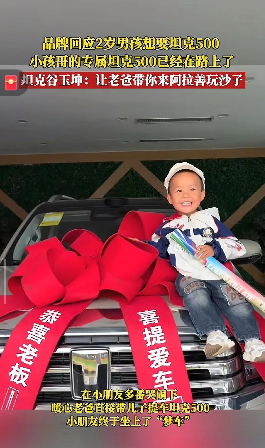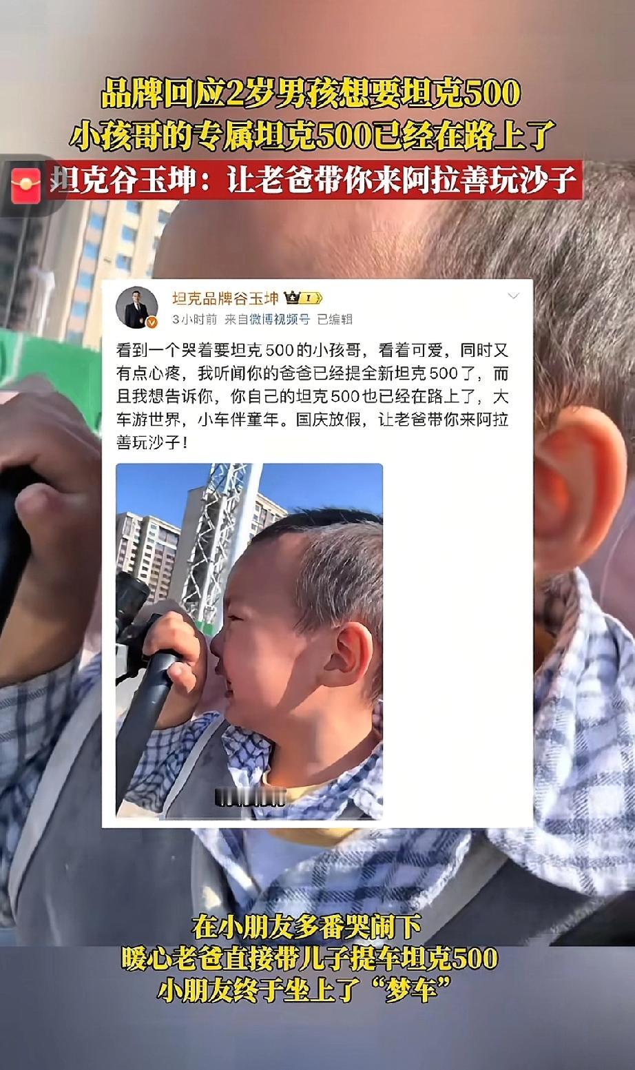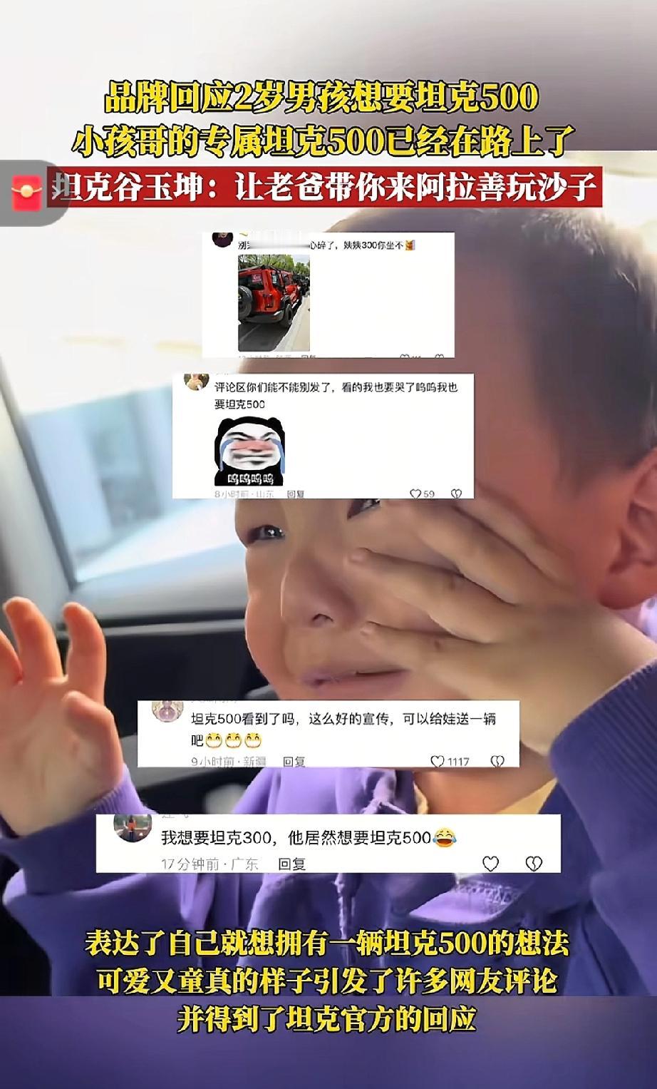 萌娃哭着要坦克500,暖心老爸直接带着儿子喜提新车!品牌方回应:你的专属坦克500已经在路上了!让你老爸带你来阿拉善玩沙子!长城的这波操作又引起众多车友的广泛好评,该说不说长城的营销在业界真的是独树一帜了。 各位读者你们怎么看?欢迎在评论区留下你的看法。