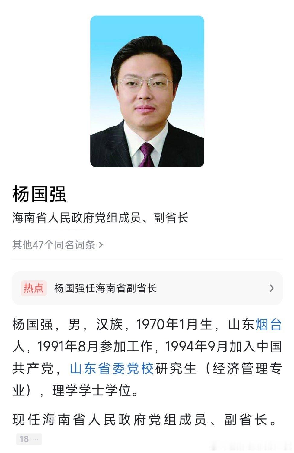 杨国强任海南省副省长,此前为东营市委书记。热点现场