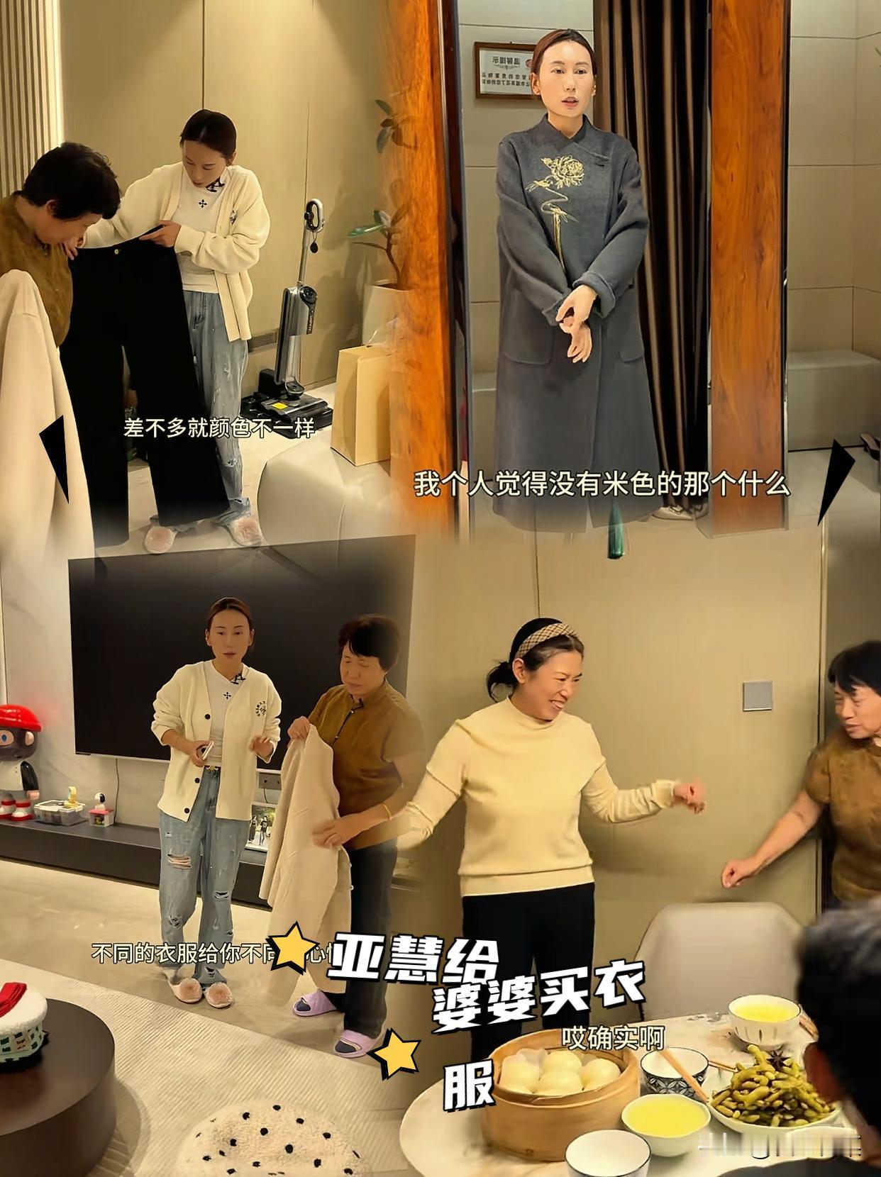 亚慧给婆婆和妈妈买衣服!亚慧对妈妈和婆婆一样好,买衣服都是一人一套,怕婆婆不要,特意不带她去,还给阿姨也买了衣服裤子,太贴心了。冷眉回乡下看婆婆,给妈妈和婆婆买点东西都不一样,网友说区别对待,可见亚慧的情商高,网友也都看在眼里