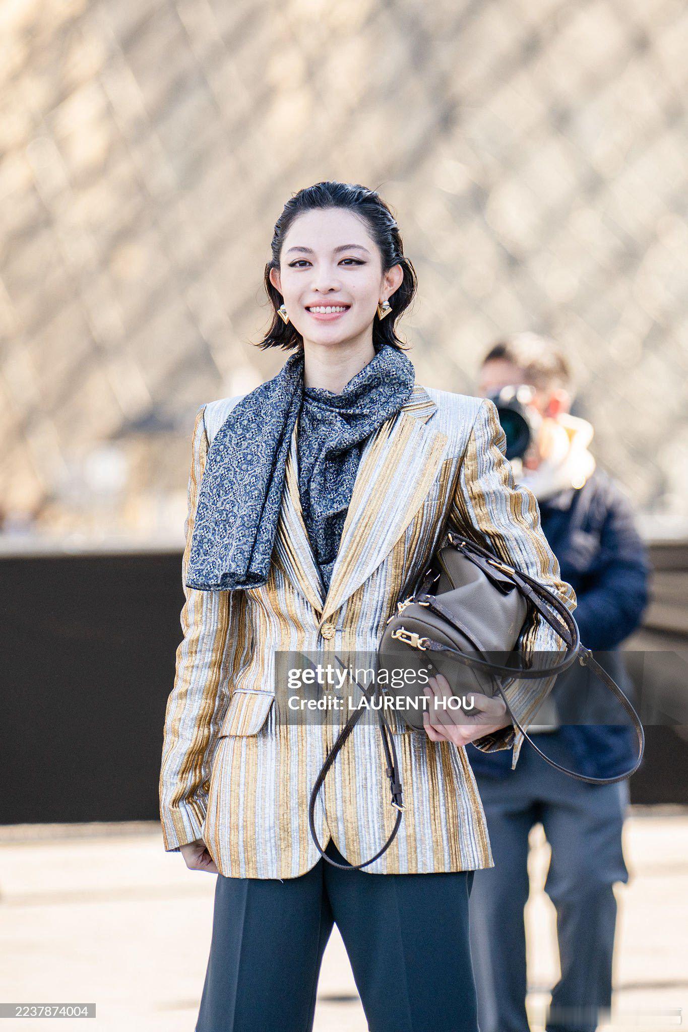 钟楚曦把G社当站姐用钟楚曦在巴黎时装周的造型堪称惊艳。她身着金色丝质西装套装,利