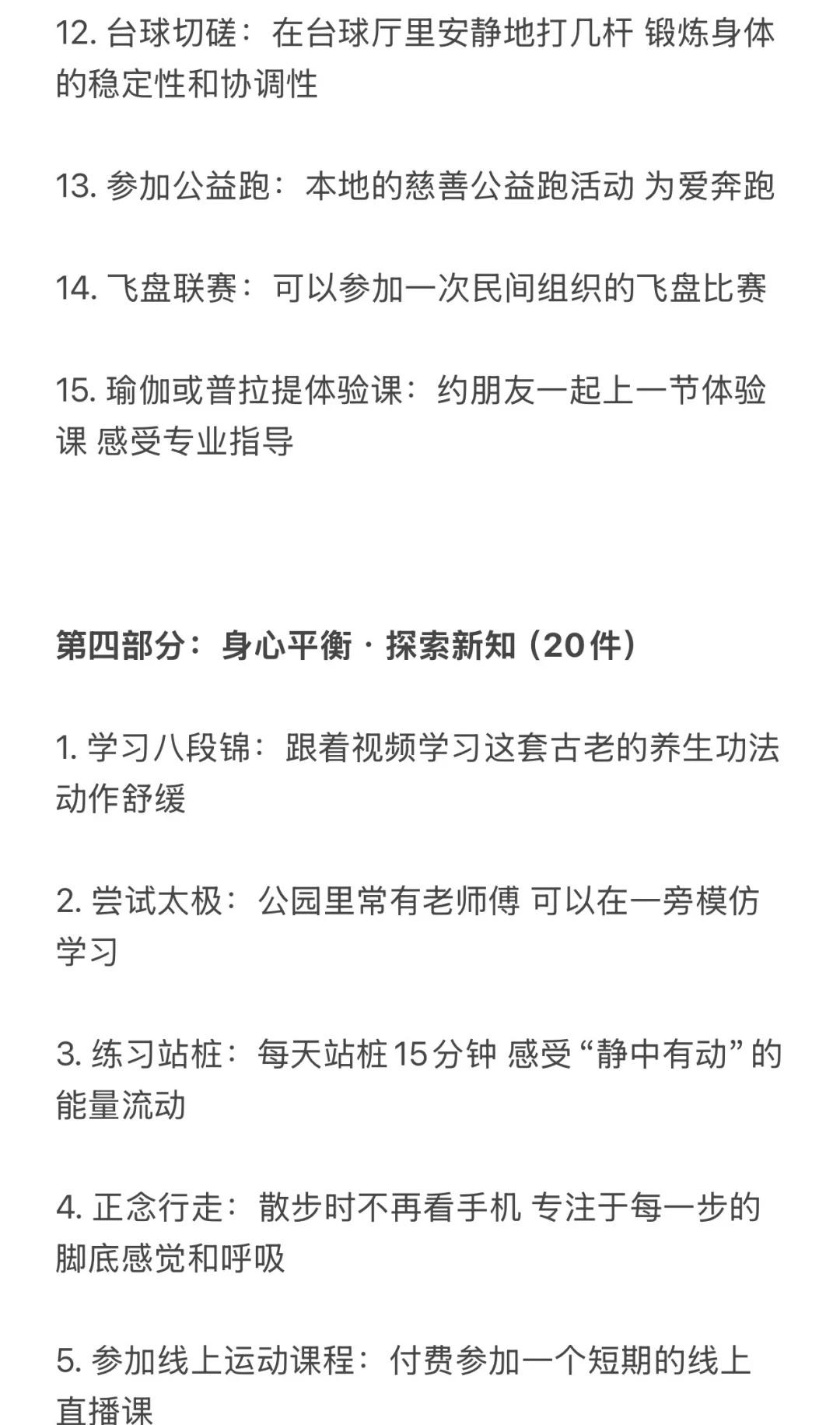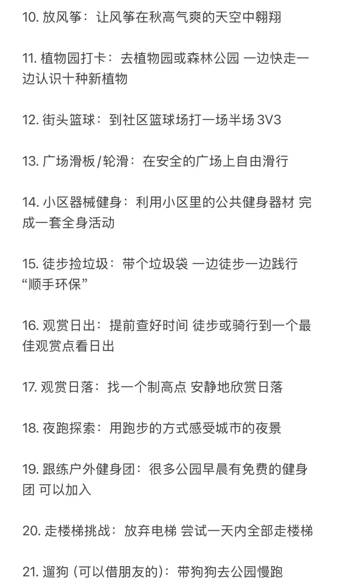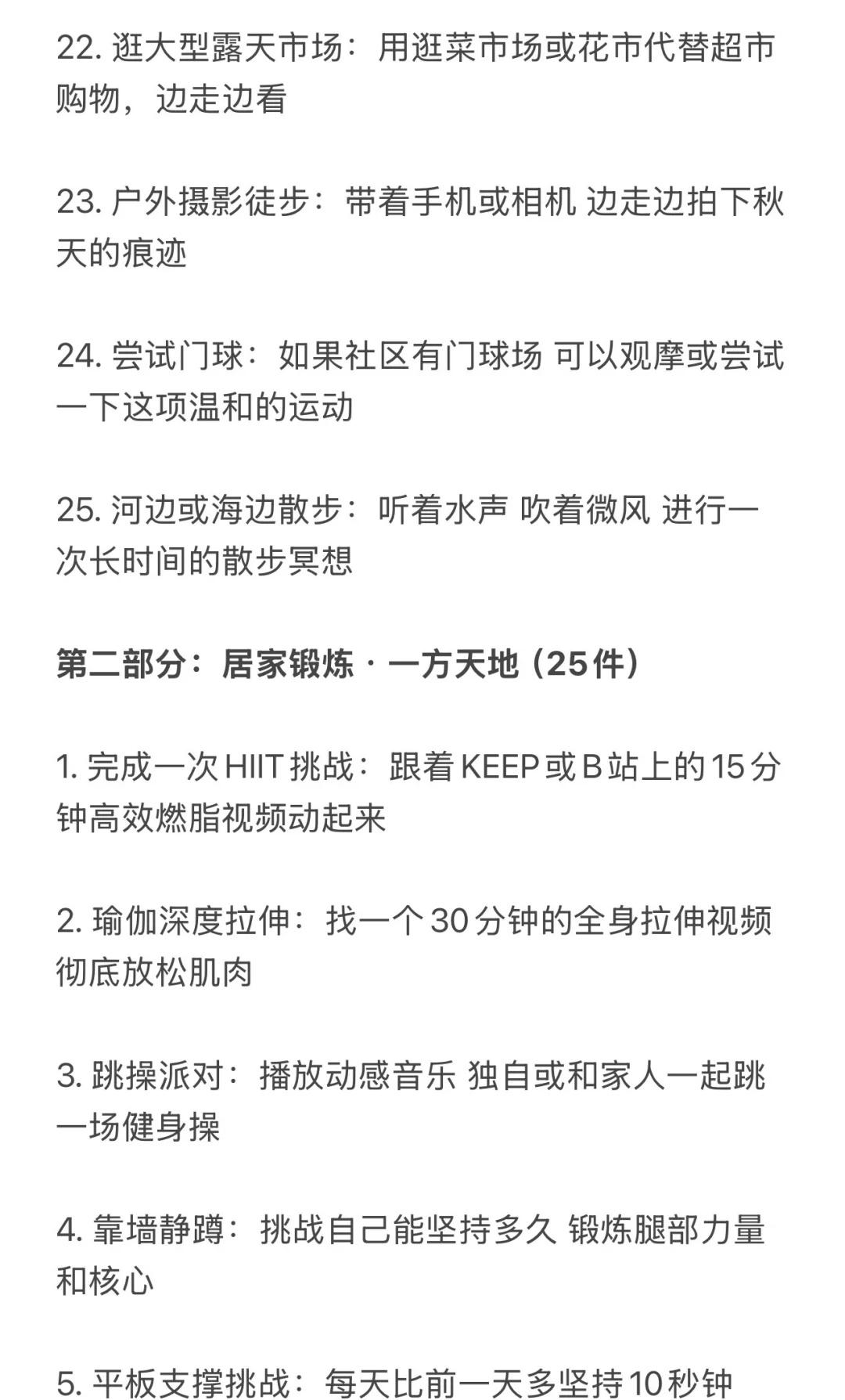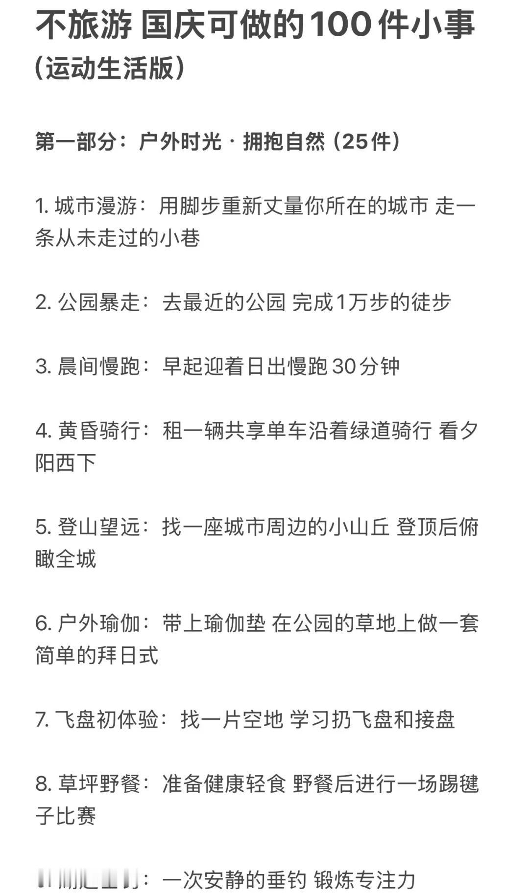反向旅游!国庆可以做的100件运动趣事🧾 不当废柴!利用国庆假期好好蜕变 修正身心 这份清单主打低门槛、易执行、重体验 旨在让你在不拥挤不疲惫的情况下 通过各式各样的“动起来” 收获一个元气满满、身心愉悦的黄金周 1️⃣户外时光(25件) 1. 城市漫游:用脚步重新丈量你所在的城市 2. 公园暴走:去最近的公园完成一次1万步的徒步 3. 晨间慢跑:早起迎着日出慢跑30分钟 4. 黄昏骑行:租一辆共享单车 沿着河岸或绿道骑行 5. 登山望远:找一座城市周边的小山丘 登顶后俯瞰全城 6. 户外瑜伽:带上瑜伽垫 在公园的草地上做一套简单拜日式 7. 飞盘初体验:约上两三好友 学习扔飞盘和接盘 8. 草坪野餐:准备健康轻食 野餐后进行一场踢毽子比赛 9. 湖边垂钓:体验一次安静的垂钓 锻炼专注力 10. 放风筝:让风筝在秋高气爽的天空中翱翔 11. 植物园打卡:一边快走一边认识十种新植物 12. 街头篮球:到社区的篮球场 打一场半场3V3 13. 广场滑板:在安全的广场上滑行 14. 小区器械健身:利用小区里的健身器材 完成全身活动 15. 徒步捡垃圾:带个垃圾袋 一边徒步一边践行顺手环保 16. 观赏日出:骑行到一个最佳观赏点看日出 17. 观赏日落:找一个制高点安静地欣赏日落 18. 夜跑探索:用跑步的方式感受城市的夜景 19. 跟练户外健身团:很多公园早晨有免费的健身团 20. 走楼梯挑战:放弃电梯 尝试一天内全部走楼梯 21. 遛狗(可以借朋友的):带狗狗去公园快走或慢跑 22. 逛大型露天市场:用逛菜市场或花市代替超市购物 23. 户外摄影徒步:边走边拍下秋天的痕迹 24. 尝试门球:可以尝试一下这项温和的运动 25. 河边或海边散步:听着水声 进行一次长时间的散步 (字数不够 请看图片) 哪怕只从中挑选几件感兴趣的开始 让身体动起来 让心情亮起来这个国庆假期就是充实而独特的! 祝你度过一个健康、快乐、不一样的国庆假期 第一批国庆旅游攻略请查收 国庆节 国庆假期 闺蜜 运动减肥 自我提升 100天运动打卡挑战 运动万粉助力计划 假期 国庆女生 女性成长学生攻略打工人宅家 @热点薯 @户外薯