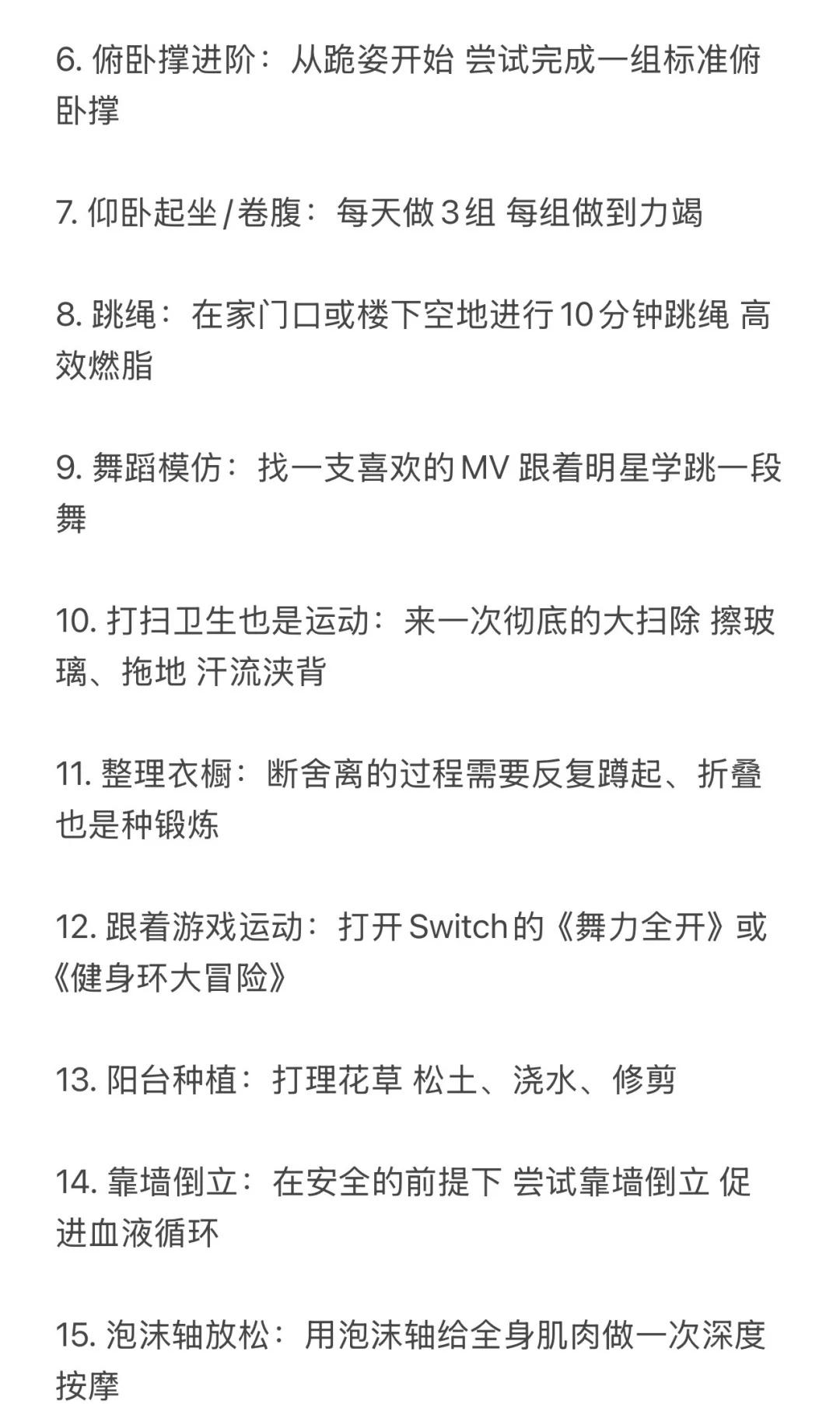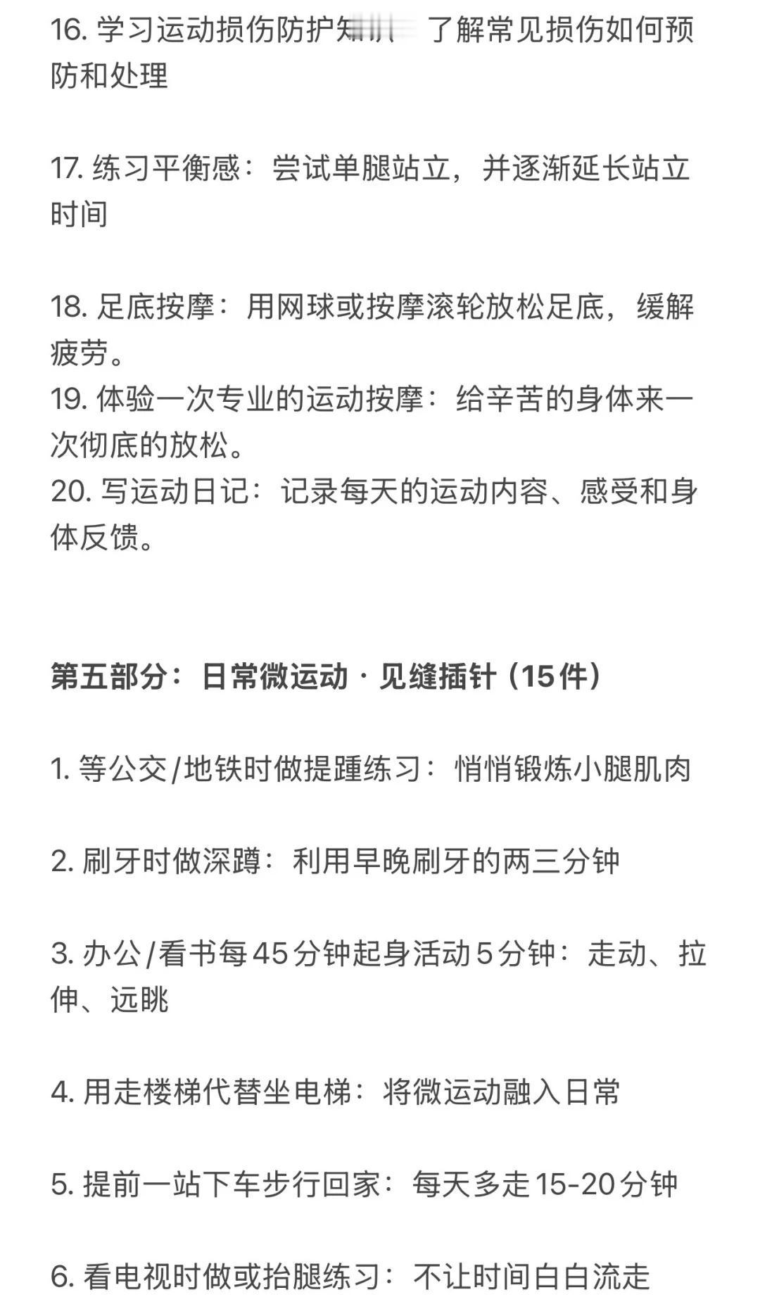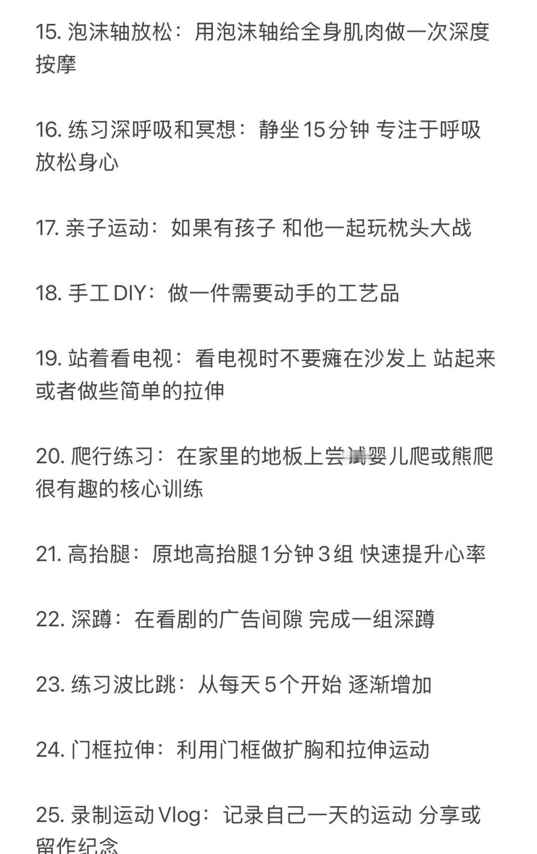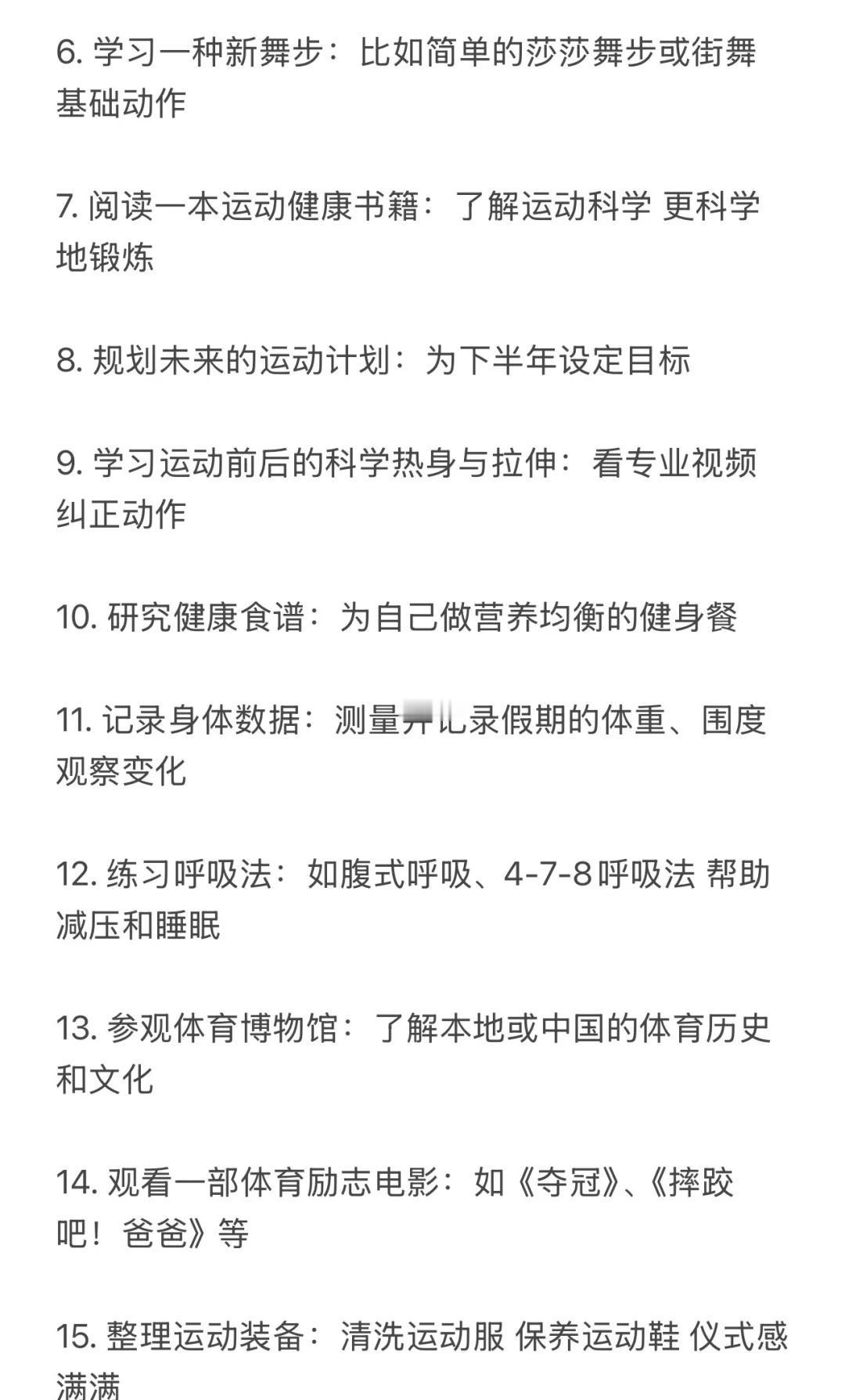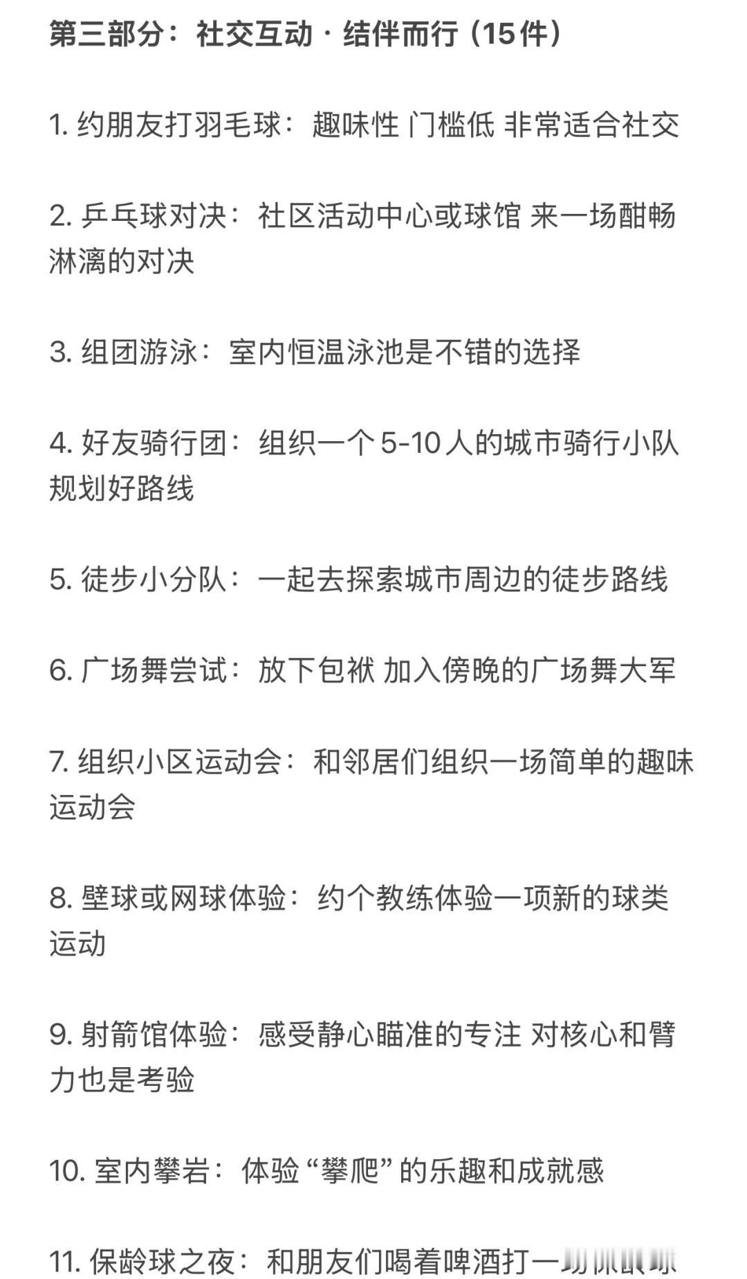 反向旅游!国庆可以做的100件运动趣事🧾 不当废柴!利用国庆假期好好蜕变 修正身心 这份清单主打低门槛、易执行、重体验 旨在让你在不拥挤不疲惫的情况下 通过各式各样的“动起来” 收获一个元气满满、身心愉悦的黄金周 1️⃣户外时光(25件) 1. 城市漫游:用脚步重新丈量你所在的城市 2. 公园暴走:去最近的公园完成一次1万步的徒步 3. 晨间慢跑:早起迎着日出慢跑30分钟 4. 黄昏骑行:租一辆共享单车 沿着河岸或绿道骑行 5. 登山望远:找一座城市周边的小山丘 登顶后俯瞰全城 6. 户外瑜伽:带上瑜伽垫 在公园的草地上做一套简单拜日式 7. 飞盘初体验:约上两三好友 学习扔飞盘和接盘 8. 草坪野餐:准备健康轻食 野餐后进行一场踢毽子比赛 9. 湖边垂钓:体验一次安静的垂钓 锻炼专注力 10. 放风筝:让风筝在秋高气爽的天空中翱翔 11. 植物园打卡:一边快走一边认识十种新植物 12. 街头篮球:到社区的篮球场 打一场半场3V3 13. 广场滑板:在安全的广场上滑行 14. 小区器械健身:利用小区里的健身器材 完成全身活动 15. 徒步捡垃圾:带个垃圾袋 一边徒步一边践行顺手环保 16. 观赏日出:骑行到一个最佳观赏点看日出 17. 观赏日落:找一个制高点安静地欣赏日落 18. 夜跑探索:用跑步的方式感受城市的夜景 19. 跟练户外健身团:很多公园早晨有免费的健身团 20. 走楼梯挑战:放弃电梯 尝试一天内全部走楼梯 21. 遛狗(可以借朋友的):带狗狗去公园快走或慢跑 22. 逛大型露天市场:用逛菜市场或花市代替超市购物 23. 户外摄影徒步:边走边拍下秋天的痕迹 24. 尝试门球:可以尝试一下这项温和的运动 25. 河边或海边散步:听着水声 进行一次长时间的散步 (字数不够 请看图片) 哪怕只从中挑选几件感兴趣的开始 让身体动起来 让心情亮起来这个国庆假期就是充实而独特的! 祝你度过一个健康、快乐、不一样的国庆假期 第一批国庆旅游攻略请查收 国庆节 国庆假期 闺蜜 运动减肥 自我提升 100天运动打卡挑战 运动万粉助力计划 假期 国庆女生 女性成长学生攻略打工人宅家 @热点薯 @户外薯