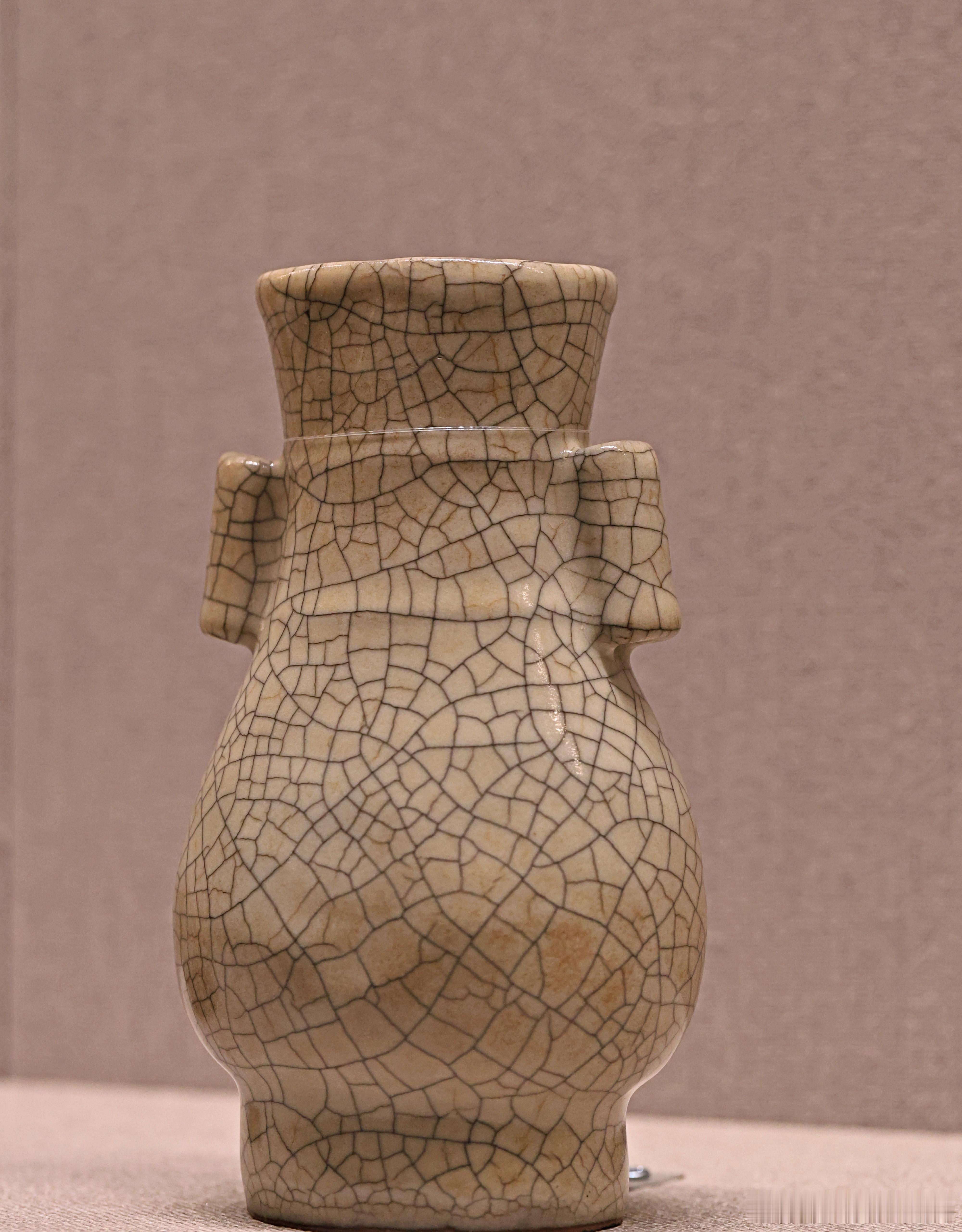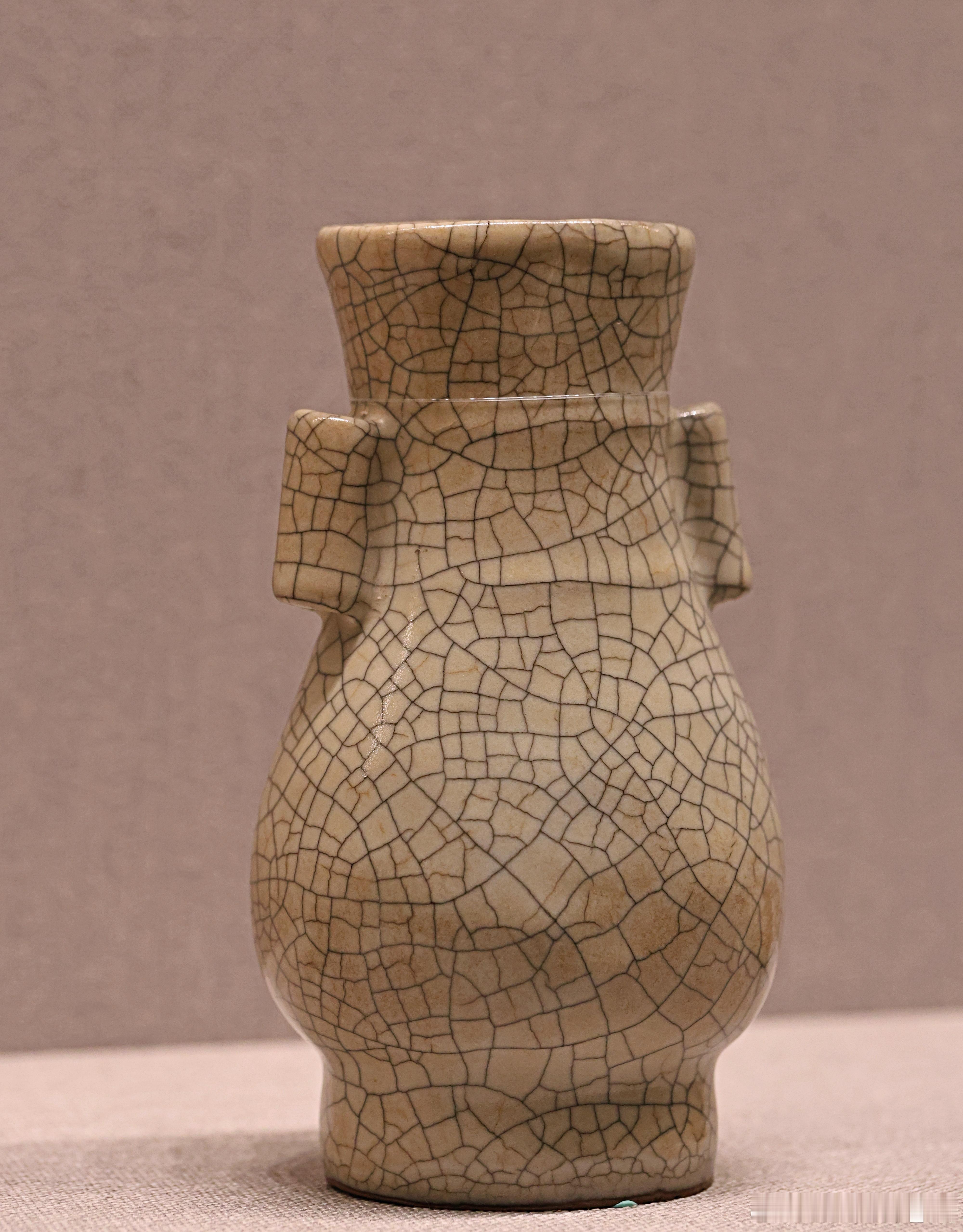 此瓶造型仿古代青铜器,古朴端庄,釉色、开片、胎色等工艺特征突出,是传世哥窑器的代表作。瓶呈椭圆体形。撇口,束颈,垂腹,圈足微外撇。颈部饰两道凸起弦纹,两侧对称置管状耳。瓶内、外和圈足内均施灰青色釉,釉面温润,布满细碎开片纹。足端无釉,露黑褐色胎。