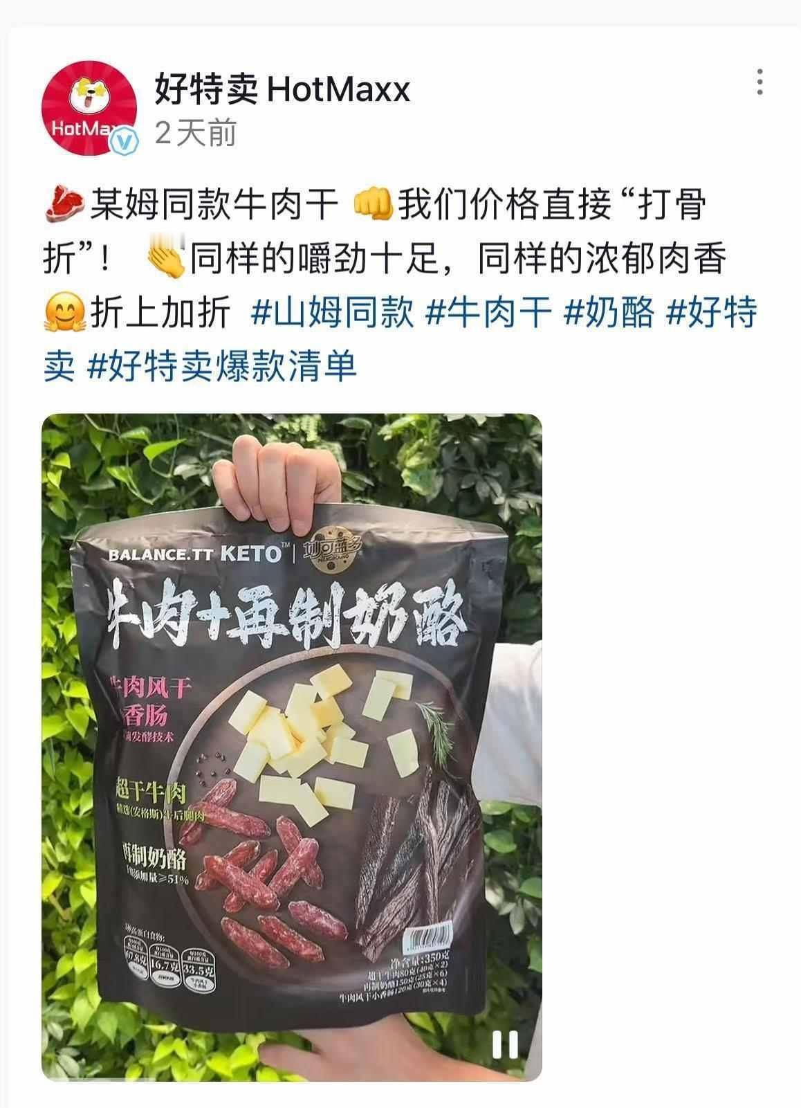 山姆同款零食39.9元上架,好特卖秒删视频,到底谁在借名卖货? 山姆会员店卖过一款牛肉奶酪零食,标价九十九块九,最近有人发现这东西在好特卖只要三十九块九,消息一传开,不少人就跑去抢,好特卖还拍了短视频,说这是某姆同款,便宜得离谱。 视频发出去没多久就被删了,南昌那边的线上平台还挂着“某姆同款”的标签,两件三十九块九,山姆小程序里怎么也搜不到这东西,北京的门店员工说根本没卖过,南昌的好特卖店员却说上周刚上架,卖得不错,可到底是不是真跟山姆有关系,谁也说不准。 这产品名字、成分、包装都差不多,牌子是BALANCE.TT,不是山姆自家的,其实是代工厂做的,山姆只是卖它的一个渠道,法律上同款不等于正品,用山姆同款做广告算不算骗人,现在没人管,消费者一看到山姆两个字,就觉得质量靠得住,其实不过是同一个厂出的,贴了不同牌子而已。 山姆同款为啥容易火,因为大家觉得山姆的东西实在,东西好还便宜,凑一块儿就是占了便宜,好多快消品其实一个厂子做的,换包裝就能卖不同价,抖音小红书这些平台也不拦着,视频火了才有人去删。 商务部鼓励开折扣店,但没说清楚能不能用品牌名,美国那边的折扣店能卖临期正品,但不能让人以为是官方渠道,咱们这边没人管,商家就靠打擦边球赚钱,消费者图便宜没问题,可平台老这么搞,以后谁还信同款这两个字。