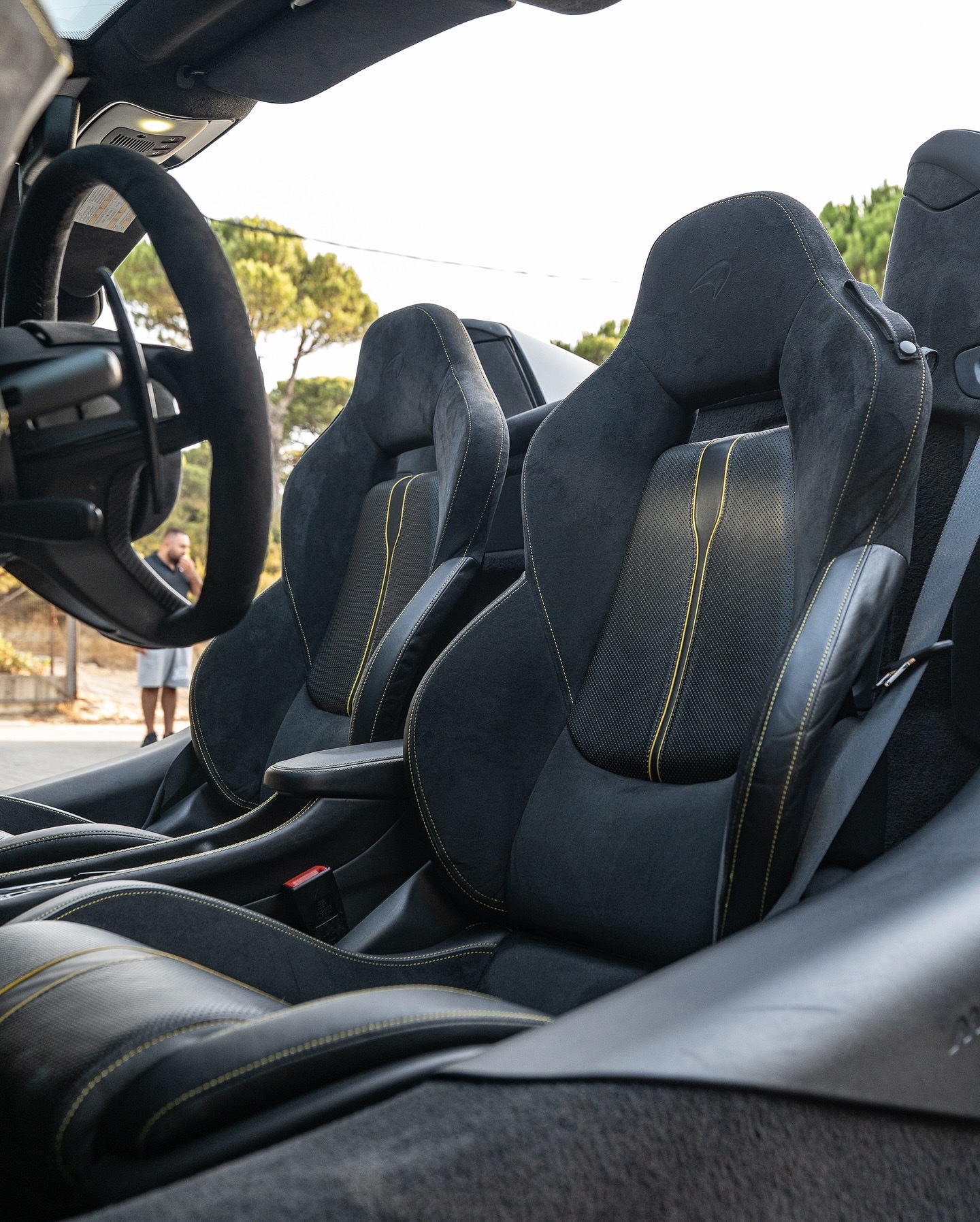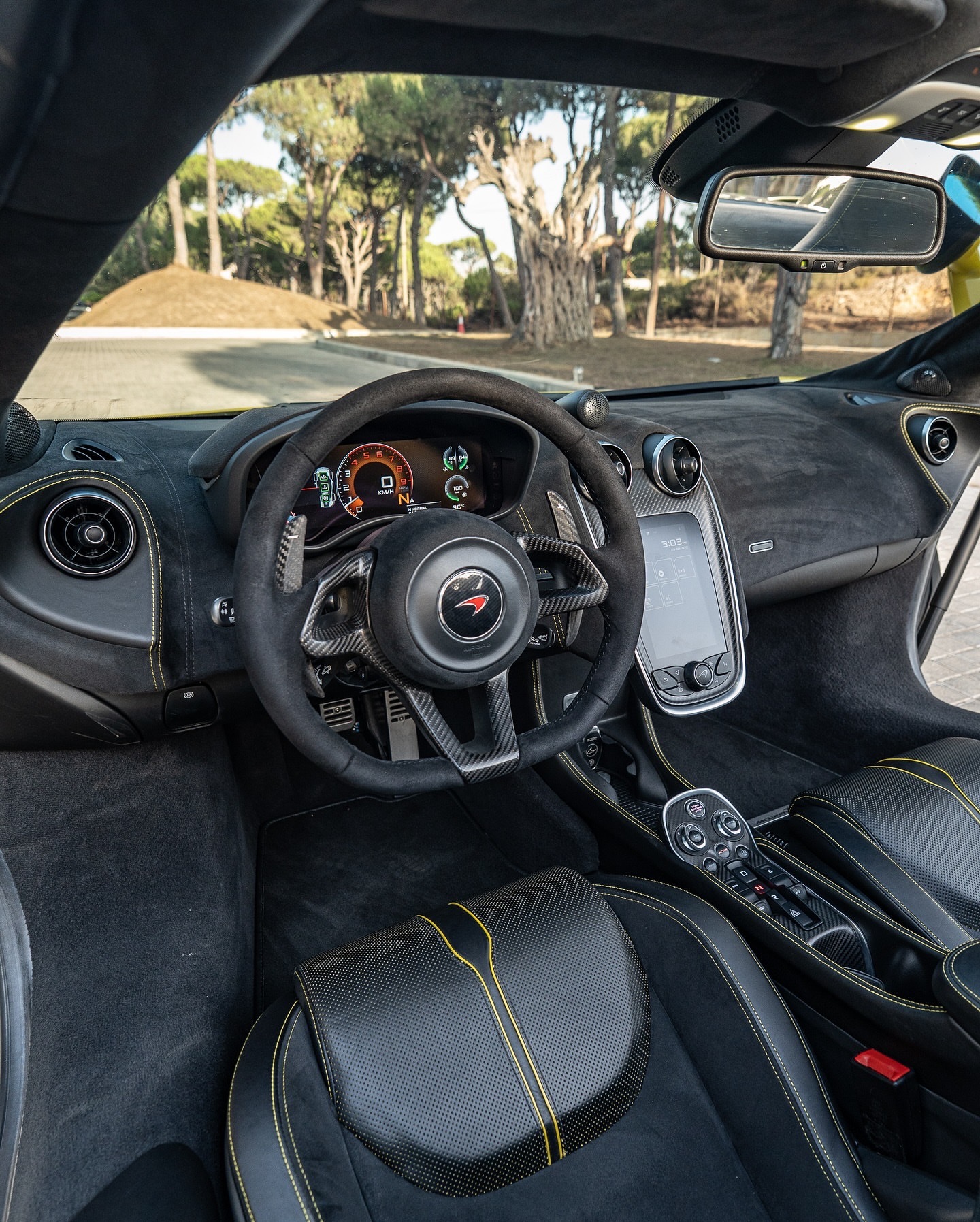 黑色皮革/alcantara 内饰,带有迈凯伦西西里黄色装饰和哑光碳纤维装饰
