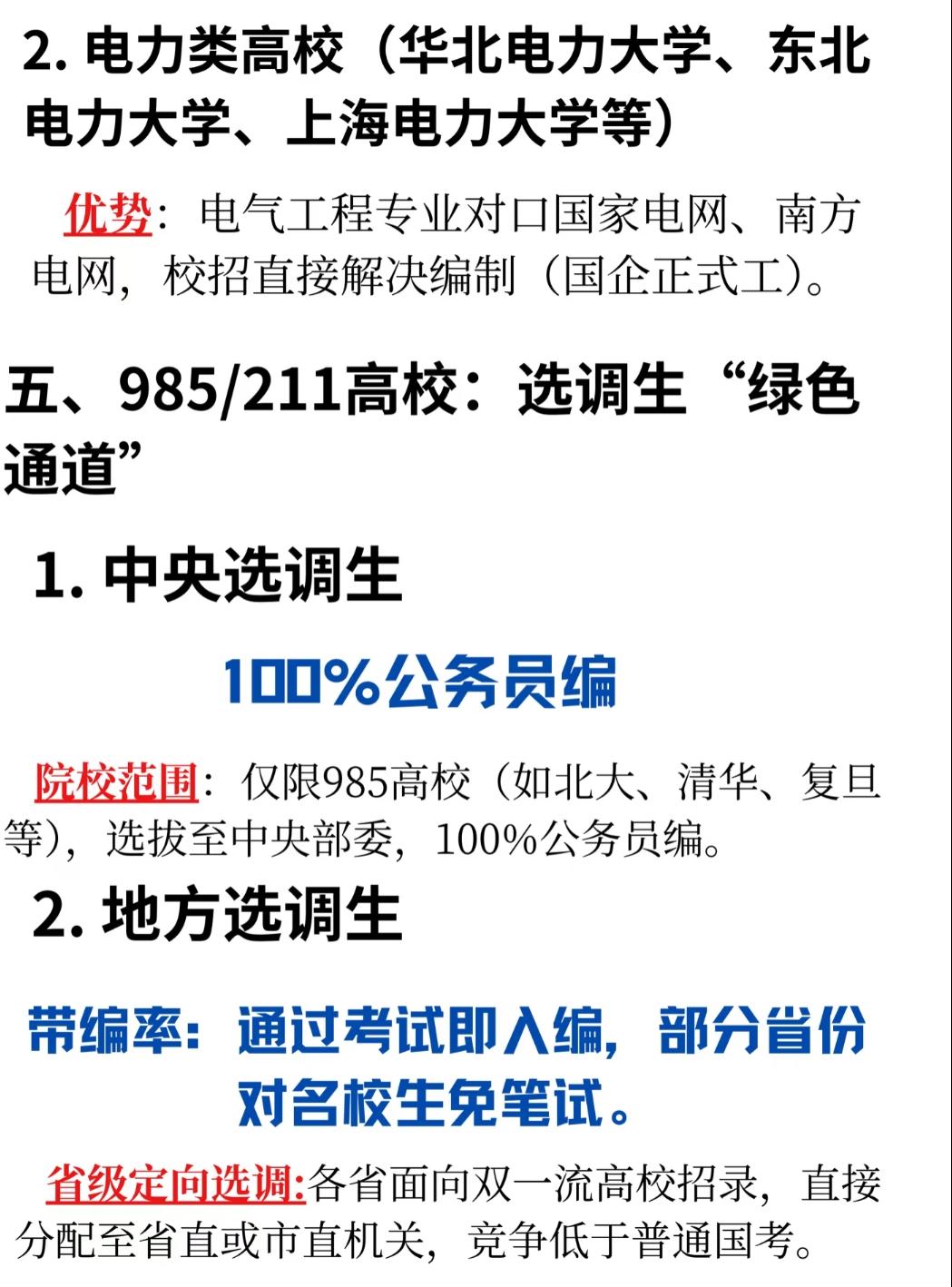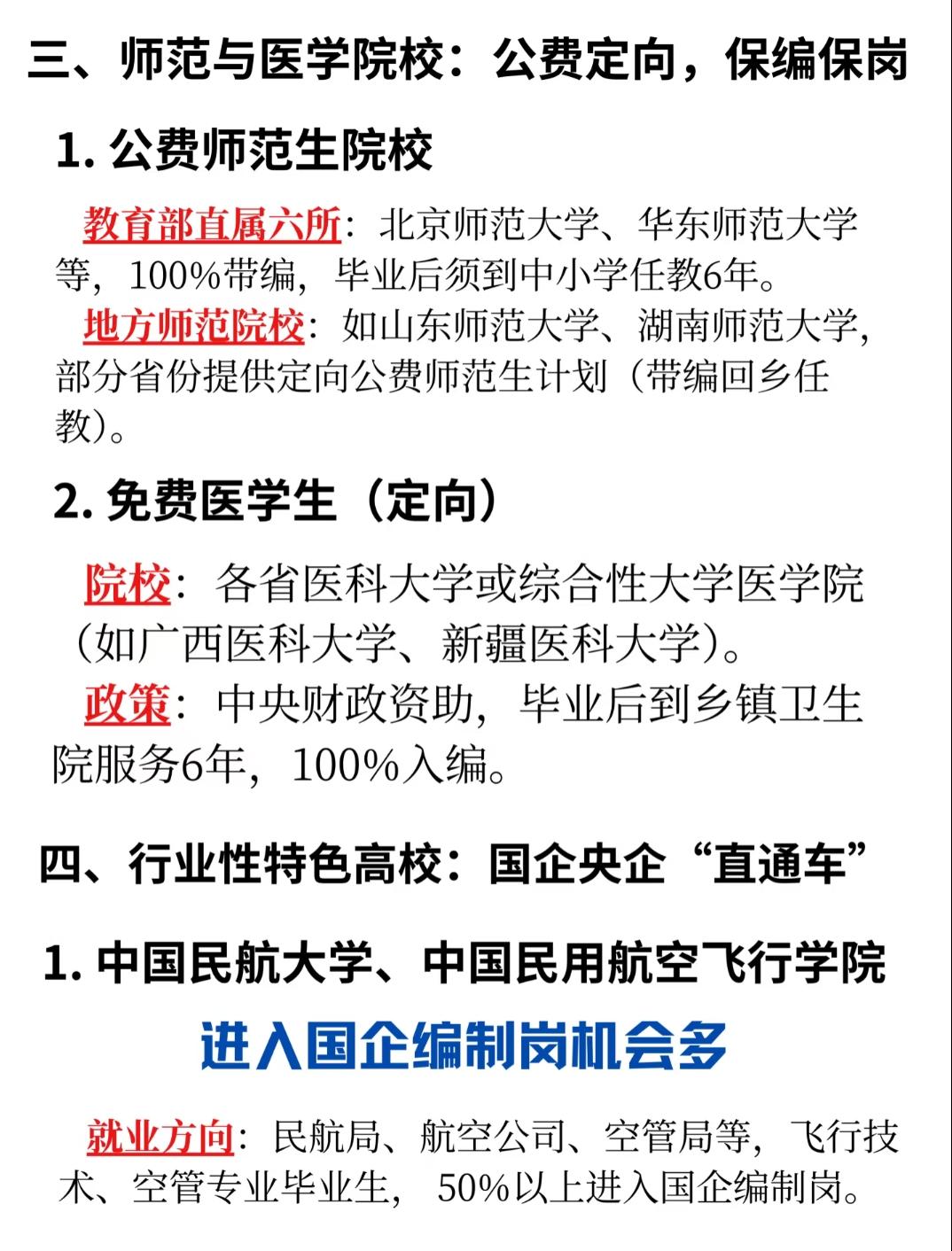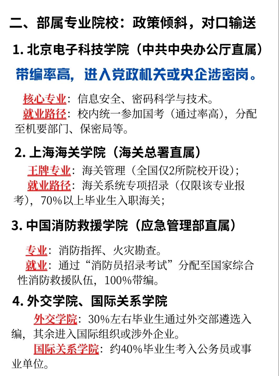 高考志愿填报表:这5类院校带编率高,就业不用愁 高考志愿填报,就业是很多家庭的核心考量。今天就来聊聊带编制率高的5大类型院校,选对了,毕业入编不是梦。 一、军校与警校:直接入编,就业保障最强 军校毕业即军官,100%带编,不过需服役一定年限。像国防科技大学,是军中“985”,毕业生授予军衔,直接进入军队科研、技术或指挥岗位;陆军工程大学、海军工程大学等各军种直属院校,专业覆盖军事计算机、通信、电子等领域,毕业按军种分配。 警校的公安专业入警率高,中国人民公安大学公安类专业毕业生可通过“公安联考”入警,入编率超90%;中国刑事警察学院、南京森林警察学院定向培养公安系统技术人才,联考通过率约85%。但要注意,警校非公安专业如法学、心理学需自主考编。 二、部属专业院校:政策倾斜,对口输送 北京电子科技学院由中共中央办公厅直属,带编率高,核心专业是信息安全、密码科学与技术,毕业生校内统一参加国考,通过率高,分配至机要部门、保密局等党政机关或央企涉密岗。 上海海关学院是海关总署直属,王牌专业海关管理全国仅2所院校开设,通过海关系统专项招录,70%以上毕业生入职海关。 中国消防救援学院隶属应急管理部,专业有消防指挥、火灾勘查,毕业生通过“消防员招录考试”分配至国家综合性消防救援队伍,100%带编。 外交学院、国际关系学院也很有特色,外交学院30%左右毕业生通过外交部遴选入编,其余进入国际组织或涉外企业;国际关系学院约40%毕业生考入公务员或事业单位。 三、师范与医学院校:公费定向,保编保岗 公费师范生院校中,教育部直属六所如北京师范大学、华东师范大学,毕业生100%带编,毕业后须到中小学任教6年;地方师范院校如山东师范大学、湖南师范大学,部分省份提供定向公费师范生计划,带编回乡任教。 免费医学生(定向)由各省医科大学或综合性大学医学院培养,如广西医科大学、新疆医科大学,中央财政资助,毕业后到乡镇卫生院服务6年,100%入编。 四、行业性特色高校:国企央企“直通车” 中国民航大学、中国民用航空飞行学院进入国企编制岗机会多,就业方向涵盖民航局、航空公司、空管局等,飞行技术、空管专业毕业生,50%以上进入国企编制岗。 电力类高校如华北电力大学、东北电力大学、上海电力大学,电气工程专业对口国家电网、南方电网,校招直接解决编制,成为国企正式工。 五、985/211高校:选调生“绿色通道” 中央选调生仅限985高校,如北大、清华、复旦等,选拔至中央部委,100%公务员编。地方选调生通过考试即入编,部分省份对名校生免笔试;省级定向选调各省面向双一流高校招录,直接分配至省直或市直机关,竞争低于普通国考。 这些院校在各自领域都有独特的就业优势,带编率高,能为毕业生的职业发展提供稳定的起点。 你对这些带编率高的院校有哪些了解?你觉得在选择院校时,就业稳定性和个人兴趣该如何平衡呢?高考推荐专业 军工类大学 专业最好院校 院校专业就业 高考铁饭碗专业 警校专业 公安院校录取