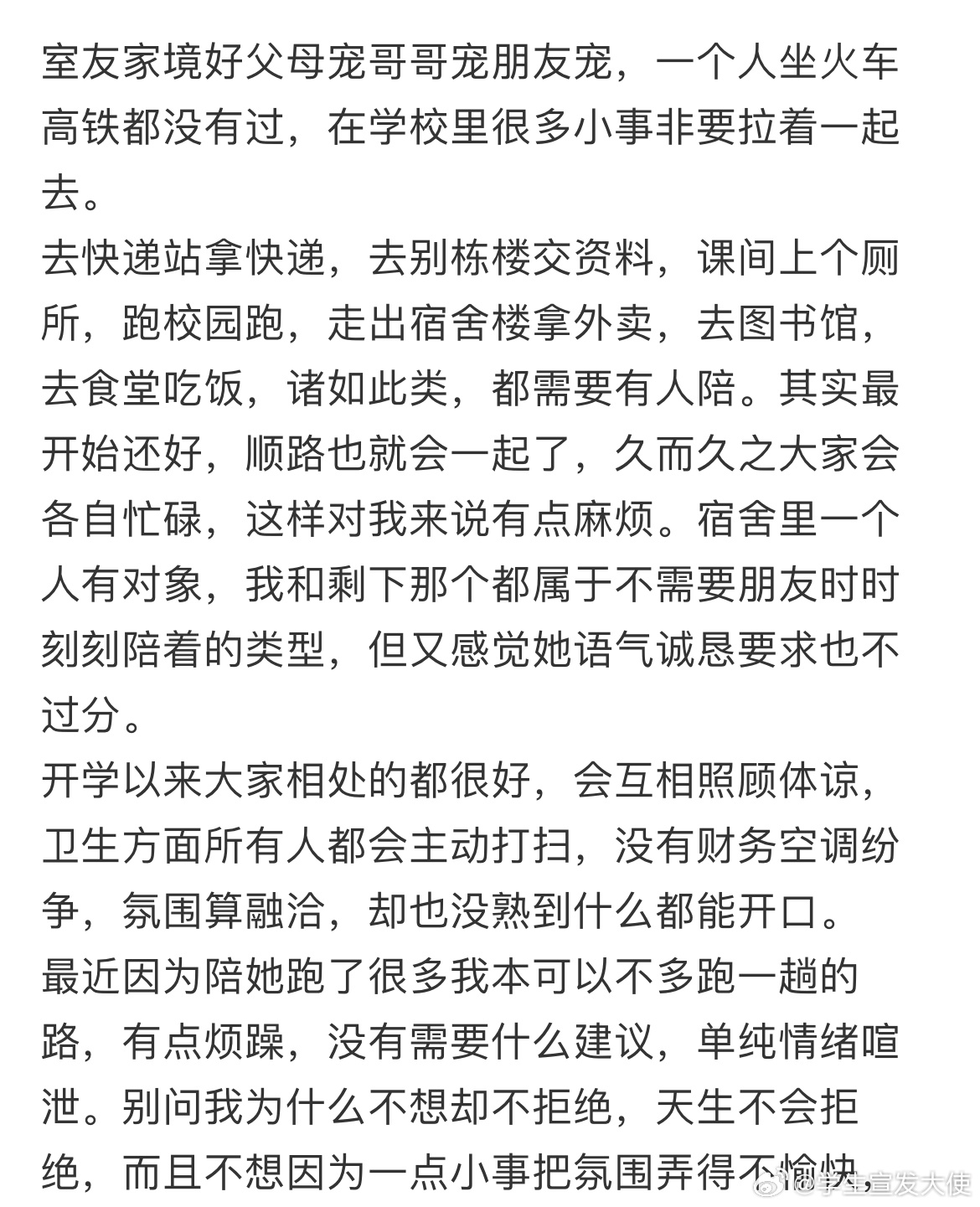 能说吗?大学什么都要人陪的室友好麻烦。