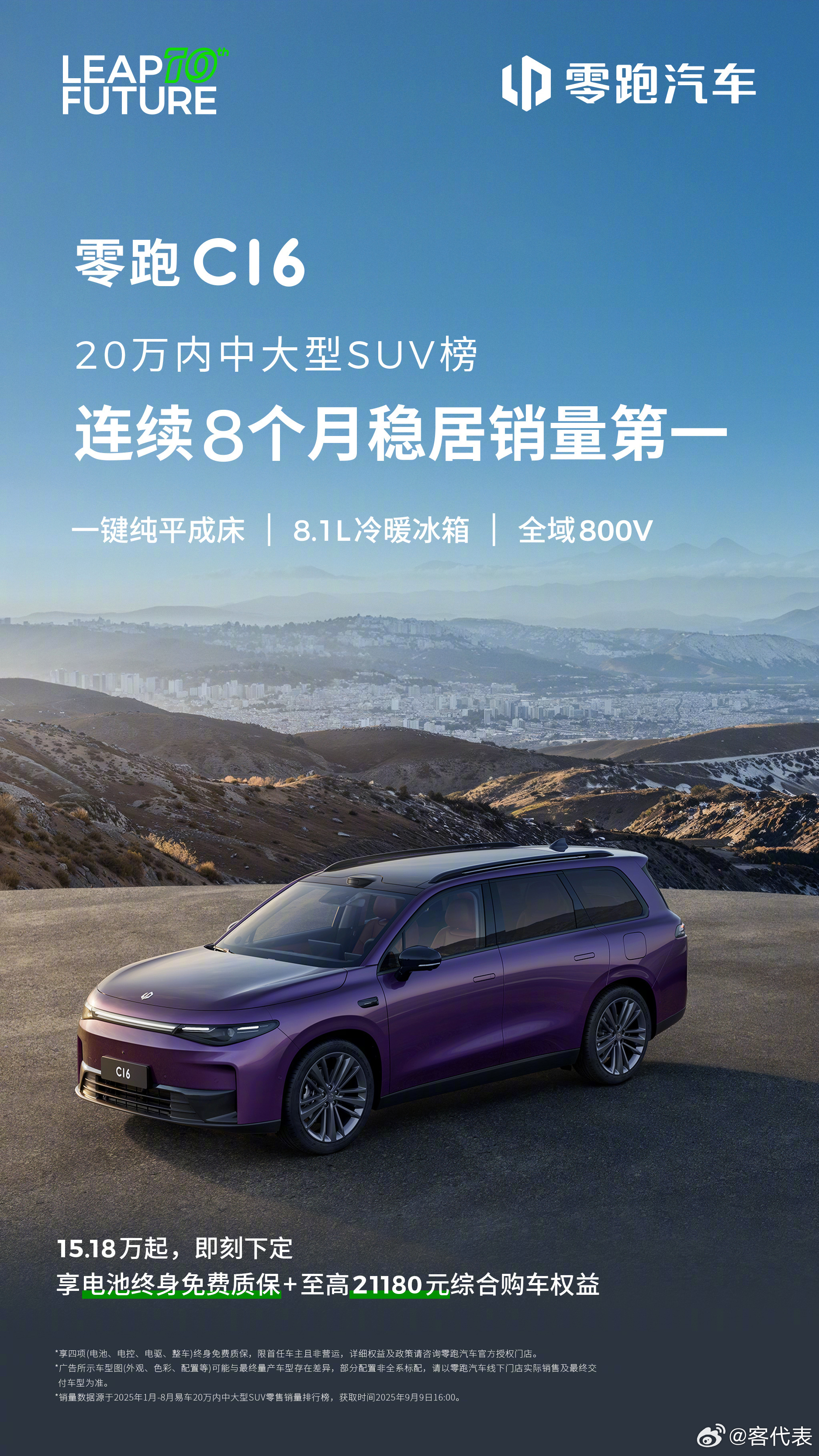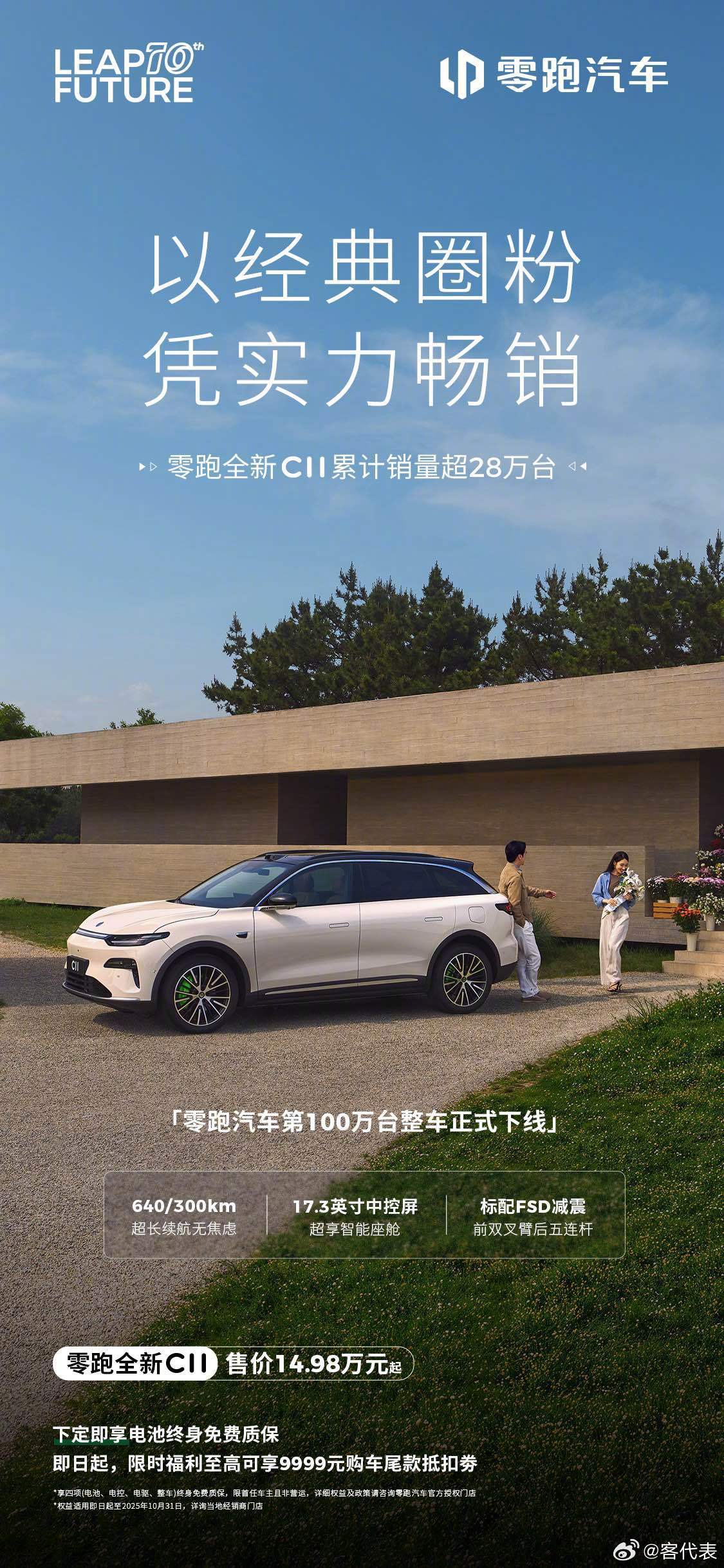 从产品层面来看,零跑对市场需求的把握相当精准,爆款频出。比如B01和B10在9月都实现了月销过万,显示出强劲的市场号召力;C10累计销量已突破16万台,稳坐新势力中型SUV头把交椅;C16在中大型SUV细分市场(20万以内)持续领先;而经典车型C11凭借不断迭代升级的产品力,四年累计销量更是超过28万台,深受用户喜爱。