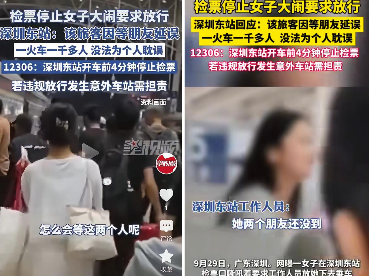国庆假期第一批‘受害人’出现啦! 9月30日深圳东站那叫一个热闹,有个年轻女子在检票出站口疯狂叫嚷“你让我进去啊”,就因为俩朋友没及时赶到,她阻碍工作人员关闭出站口。工作人员也无奈呀,一车1000多人呢,哪能因2个人耽误大家。 大家都知道,坐车得提前到场候车,这女子虽提前到了,可检票时朋友还没影。其实就俩选择,要么自己走,要么票白买。她却选了违法那招,阻碍关检票口,让1000人等2人。这哪是为朋友“两肋插刀”,分明是一起“社死”。就一张车票钱的事儿,闹得全网都知道。 控制情绪真的太重要了,不然小问题变大麻烦。遇到这情况,你会咋选?