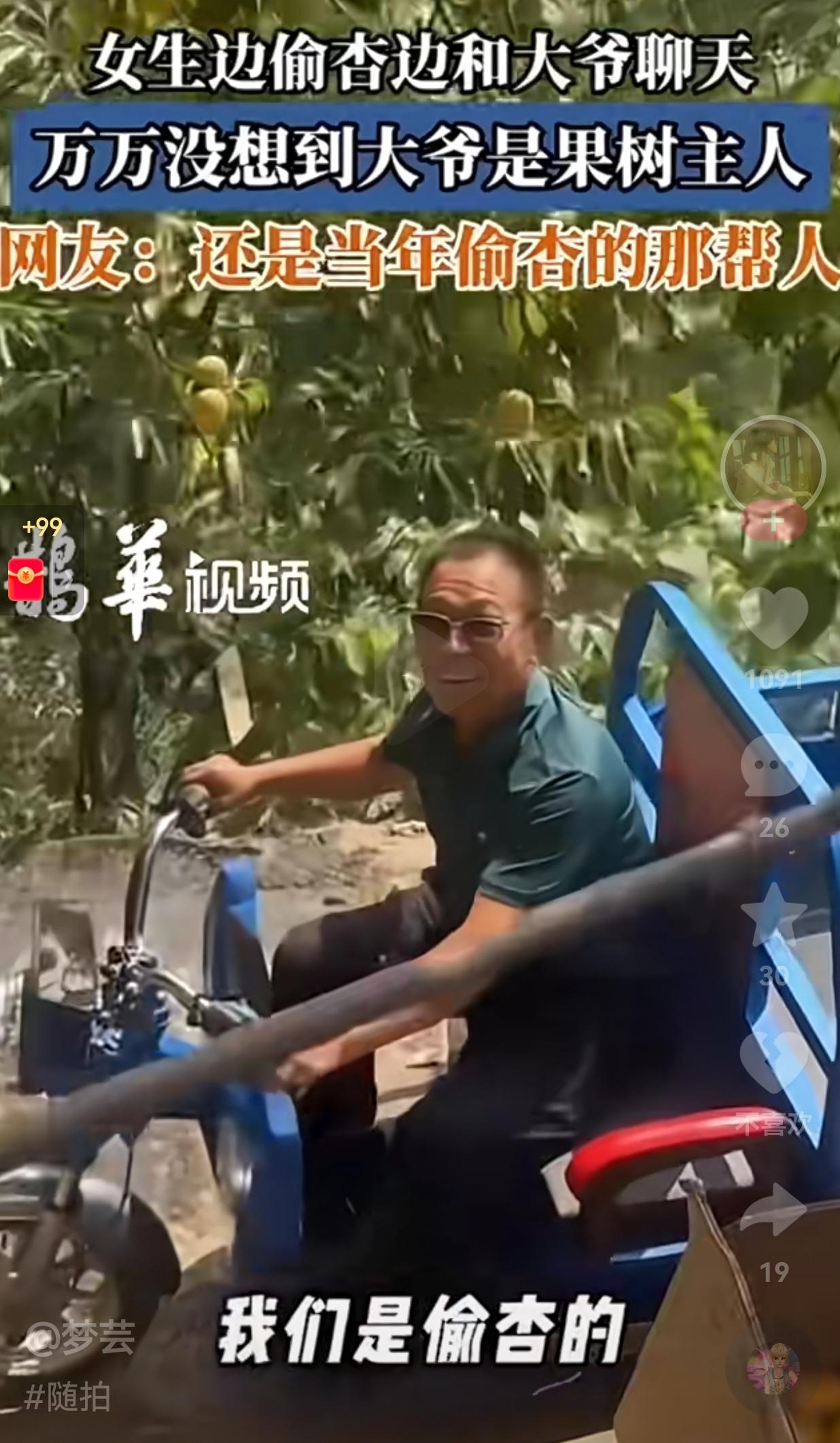 真的是冤家路窄呀!女生回村看到邻居家的杏子熟了,由于自己嘴馋,实在忍受不了了,就想着趁邻居家没人的时候,摘一点杏子回来尝一尝。 这天中午,女生看到邻居家房门紧闭,这一看就是没人的情形。 因此,女生带着自己的箱子,拿了一个竹竿,偷偷地来到邻居家开始敲打杏子。 谁知道害怕什么就来什么?不一会儿,女生正摘得开心的时候,这个时候一位骑着三轮车的大爷回来了。 女生看到大爷,一开始还以为大爷和自己是同道中人呢?因此就说出了自己此行的目的。 女生说:“我是偷杏的,你也是偷杏的吧?” 接下来大爷的一句话,让女生尴尬至极,大爷说:“这就是我家,这杏子也是我的。” 女生听到大爷的回答后,一直狂笑不止,估计她也只能用大笑来缓解内心的尴尬吧? 网友看到后评论说,你没记住年轻时候的大爷,大爷也没认出长大的你。 还有的网友说,现在的人,真的是盼着孩子去偷,隔壁家的大爷还特意在树底下放了梯子,搞果的那个长长的杆子。 “万里长城今犹在,不见当年偷杏娃!”小时候很烦别人偷自己家的杏子,长大了却渴望有人偷自己家的的杏子。因为,现在人不缺吃不缺喝的,很多人都不屑于偷杏子吃了,试想一下没人吃了不就浪费了吗? 大家觉得呢?欢迎大家评论区讨论留言。