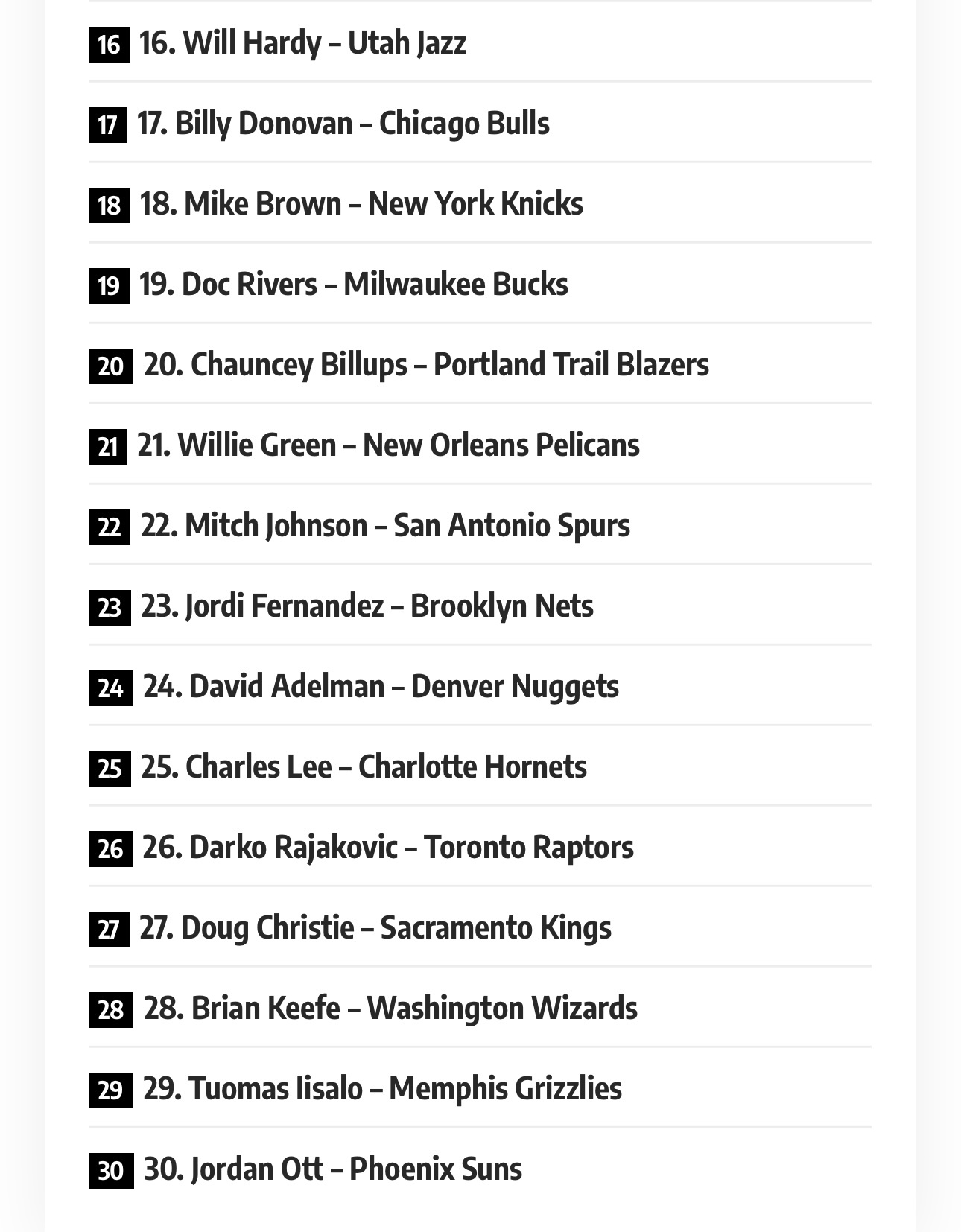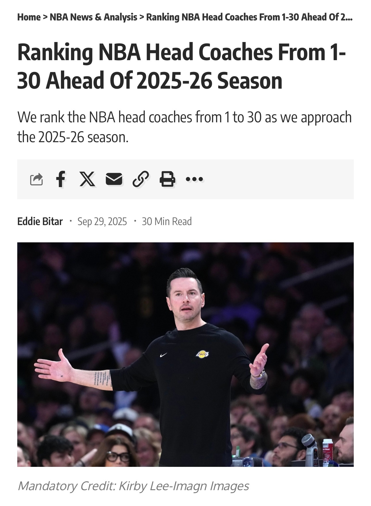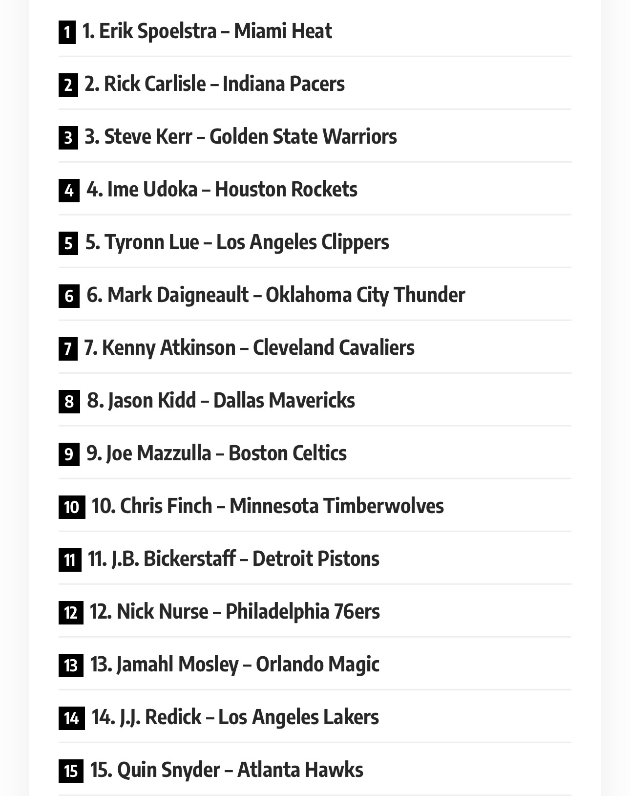 美媒Fadeaway World为联盟各队主教练排名,斯波、卡莱尔、科尔前三,雷迪克排进上半区,第十四位。