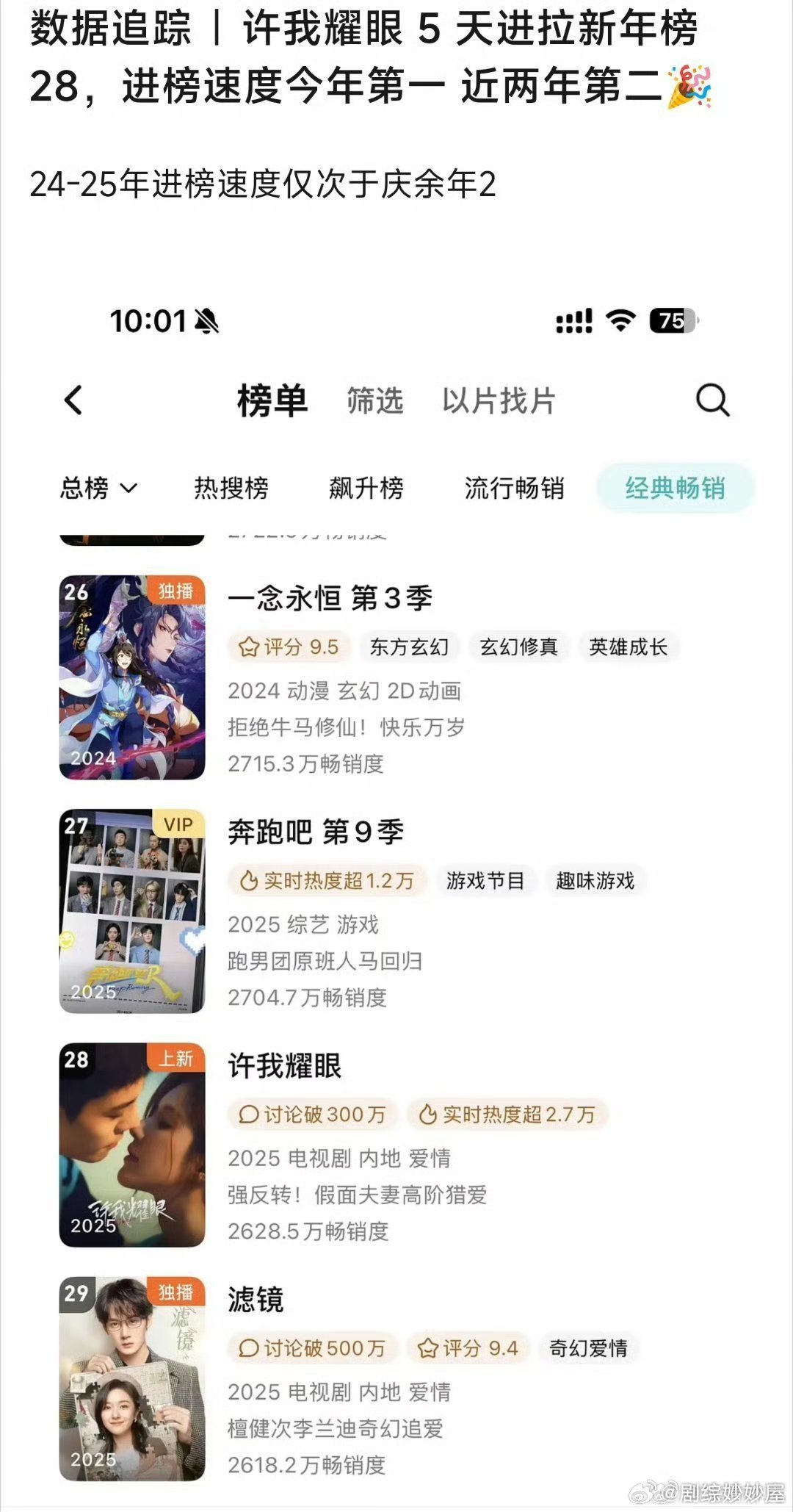 许我耀眼5天进🐧拉新年榜28,进榜速度今年第1️⃣近两年第2️⃣,仅次于庆余年2[doge]