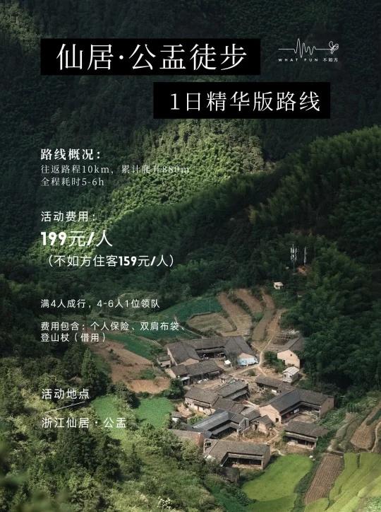台州公盂!|国庆进山🚶浙江有自己的世外桃源 公盂古村,位于仙居大山深处海拔620米的山坳中,省内少有的未通公路的村落之一,只有步行可达,保留着原始的自然风貌,被户外爱好者们称为「华东香格里拉」⛰️ 这个国庆,我们一起走进山野,住不如方,徒公盂美景🚶♂️ · 「不如方秋日Fun——公盂徒步1日版」 · ⏰ 活动时间 9月30日-10月8日(十一期间),09:30—15:30 · 📍 路线 距离:往返10km 累计爬升:约880m 预计耗时:5-6h ✔️适合人群:户外爱好者,有一定体能。儿童需满7周岁,能够独立爬山; ✔️ 往返同一条路线,体力不足可随时原路下撤; ✔️ 到目的地后视队员体能状态选择登顶望远或村庄探秘; · 💰 活动费用 不如方住客优惠价:159元/位; 非住客活动价:199元/位; (需提前2天预约,满4人成行) *费用包含:小青蛙户外领队带队、单日户外保险、不如方双肩布袋、登山杖无偿使用; (4-6人1位领队,7人及以上2位领队) - 🏠住宿推荐:仙居不如方 🌿距离徒步起点驾车20min,公盂山脚下的度假美宿——2栋山间villa、超大户外庭院、4只猫猫店员,让身躯在舒适惬意的居住空间里彻底放松和呼吸 🌿周边自然资源丰富,玩水、徒步、骑行、登山,让灵魂的本真在淳朴的乡野和宁静的自然里复原生长,肆意舒展 🌿订房可享落胃早餐,现蒸小笼包/现煎麦饼回味无穷;晚餐可提前预定地道农家菜 · 🥳民宿周边游玩: 📍淡竹玻璃水(步行或驾车30min内多处玩水点,门口就是小溪,攻略可看往期笔记) 📍神仙居(距离南门驾车20min) 📍皤滩古镇(驾车30min) 这地我熟 这路我熟 十一户外漫游 自驾探索编辑部 旅游编辑部 去山里过秋天 江浙沪周边游 仙居不如方 淡竹