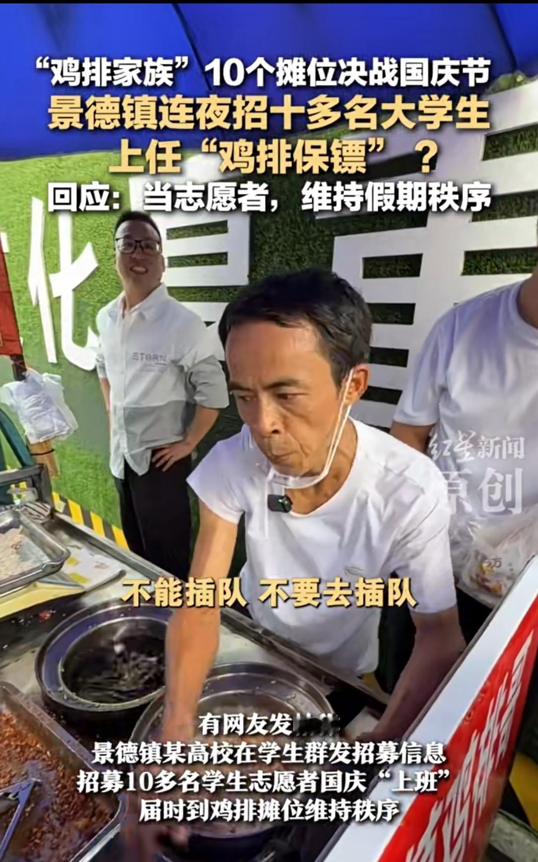 景德镇鸡排摊惊现“大学生保镖”?官方一句话戳破误会 近日有游客晒图爆料:景德镇“鸡排家族”要开10个摊位冲国庆档,连夜招了十多名大学生站在摊前,配文戏称这是“鸡排保镖天团”,专门镇场子。 帖子一火,评论区立马炸了——有人调侃“买份6元鸡排还配保镖,这排面绝了”,也有人好奇“难道是怕人抢鸡排?”。结果官方很快出来澄清:哪是什么保镖,这些大学生都是志愿者,专门来帮着维持排队秩序的。 要知道“鸡排家族”的火爆早不是新鲜事。核心人物“鸡排哥”李俊永,靠6元鸡排加脱口秀式卖货圈粉,连亲戚开的摊都被网友打包叫“家族”。之前单个摊位就常排3小时队,队伍拉得跟长龙似的,最长能有200多米;有顾客下午4点就来蹲,还差点没抢到。 这些热闹背后,就是事件的起因——国庆要开10个摊,人流量肯定翻番。“鸡排哥”他们光亲戚帮忙就十几人,还忙到凌晨备料、一天睡3小时,根本顾不过来秩序,这才请大学生当志愿者搭把手。鸡排哥景德镇 鸡排达人 景德镇鸡排嫂 景德镇鸡排哥 作者声明:素材来源网络