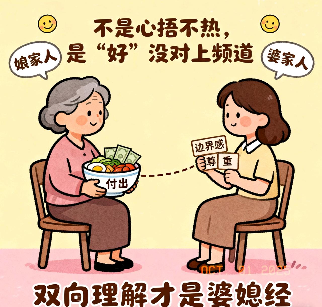 我发现现在的儿媳妇们普遍存在以下几种现象 总说儿媳妇不知足、捂不热?其实根本不是人心冷,是婆媳间的“好”没对上频道! 公婆觉得掏心掏肺对她好,可能是天天做饭、帮衬带娃,但儿媳妇要的是边界感——别总盯着她花钱、别插手小两口的事。 说她只想着娘家人,别忘了娘家是她活了二三十年的家,那种亲近本就不一样,就像儿子遇事也先找妈似的。 哪有什么捂不热的心,只有没给到的理解。 你把“付出”落在她需要的地方,她自然会把婆家当自己人;可要是用“为你好”绑架她,再热的心也会凉。 你觉得婆媳处得好,关键是公婆多让着点,还是儿媳多包容点?来唠唠~婆媳关系 婆媳相处之道 婆媳人生感悟 婆家的真实困惑 日常怼婆婆 婆媳相处妙招 婆媳差异