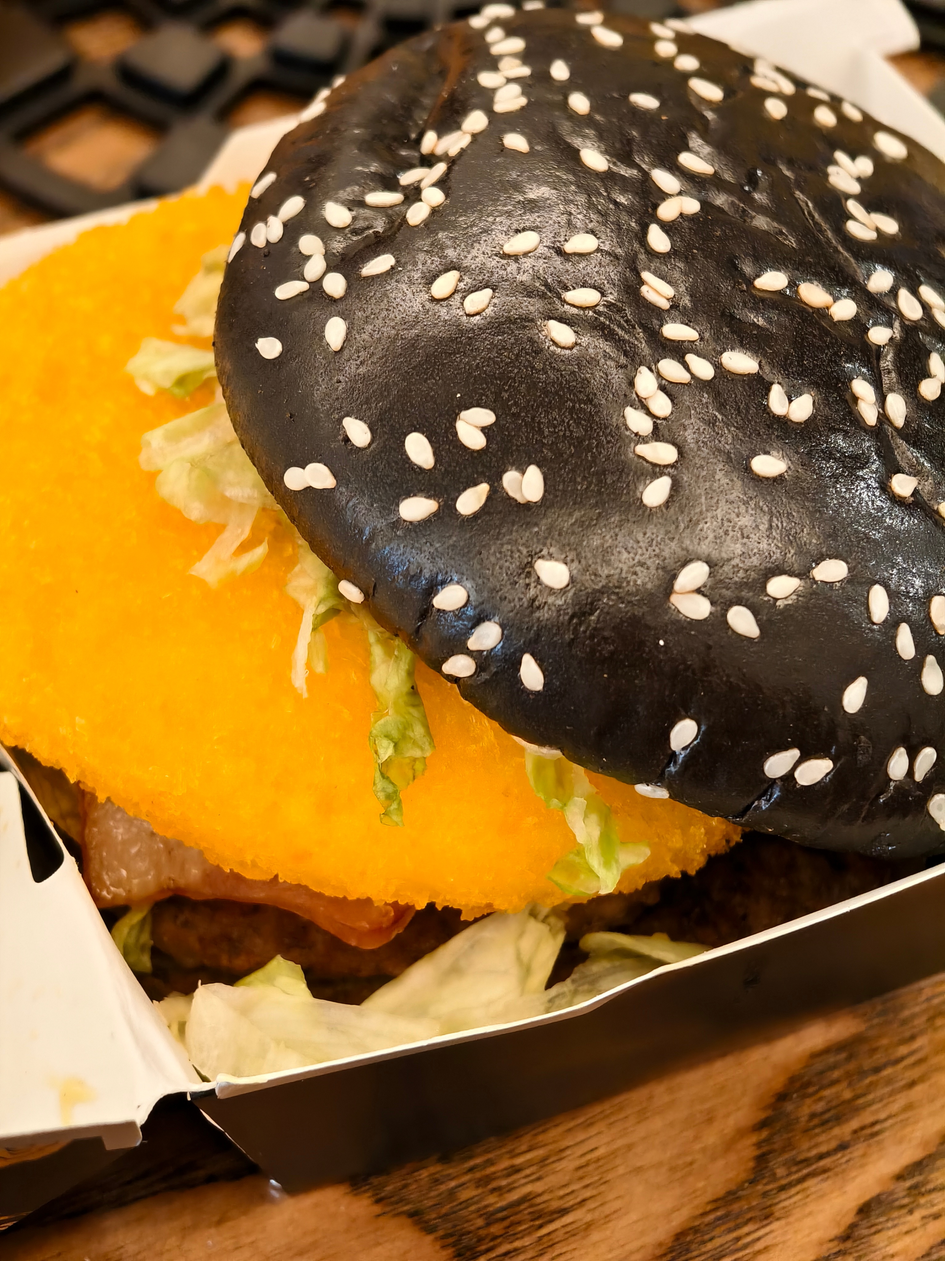 终于买到了黑吗喽联名的汉堡,没想到那个黄色的片片是纯芝士[淡淡的]好腻CICI说