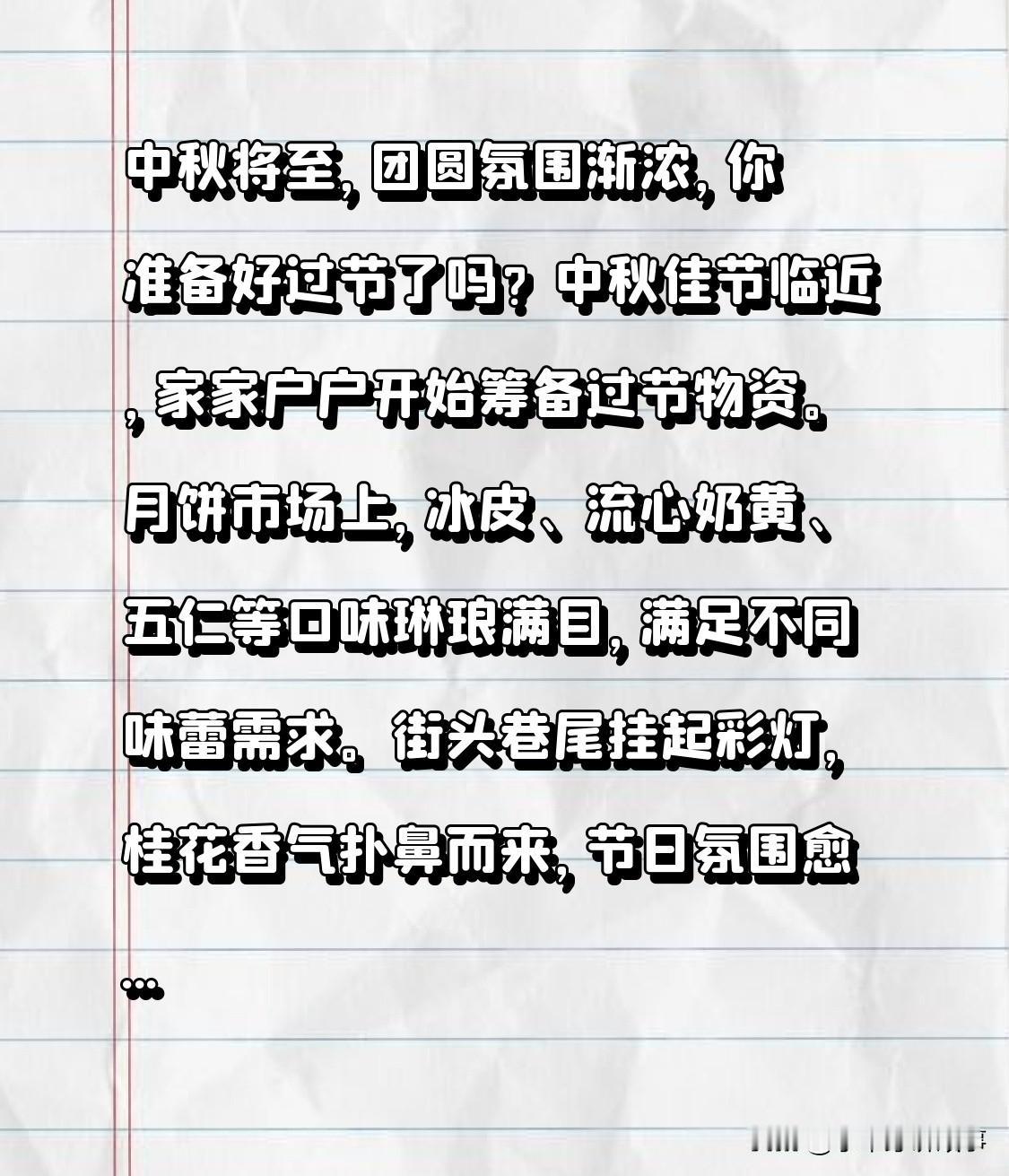 中秋即至,团圆气息渐盛,你做好过节的准备了吗? 佳节临近,家家户户着手筹备过节物