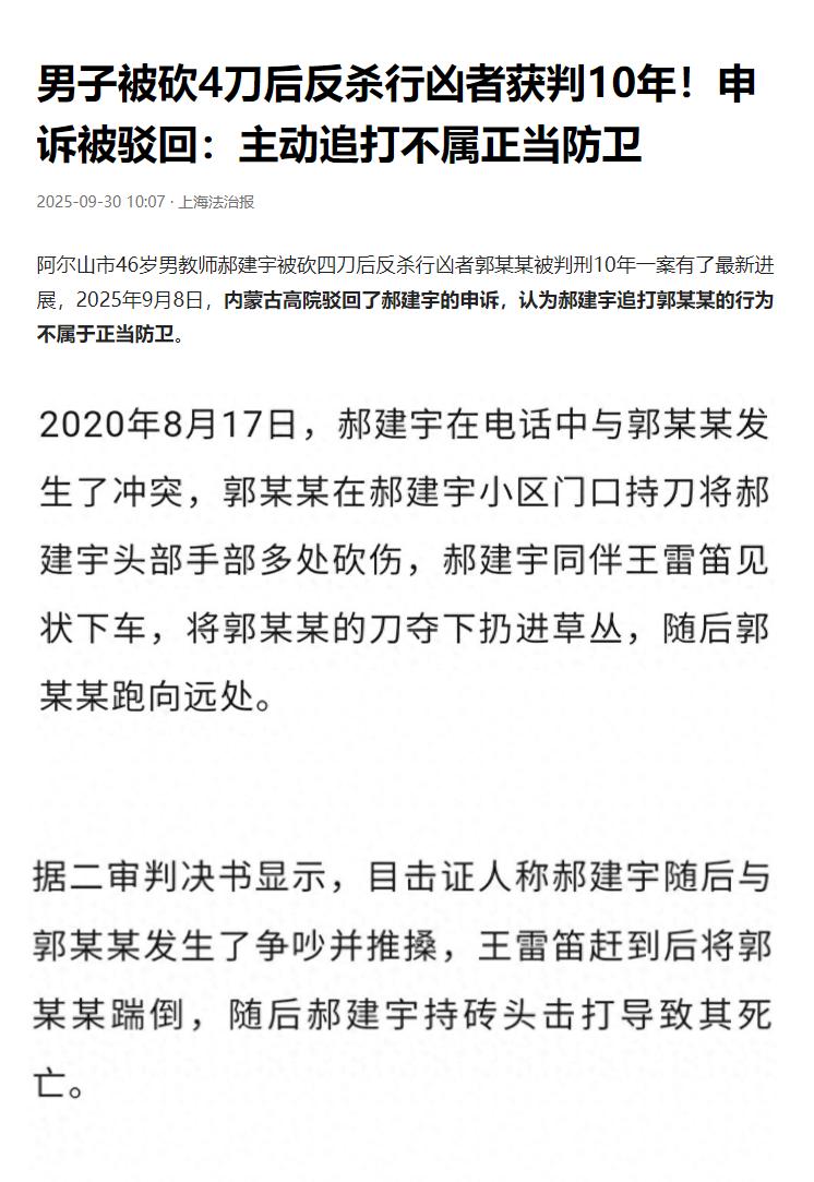 内蒙古兴安盟,一男老师从朋友车上下来后,遭人持菜刀疯狂砍击。朋友见状冲下车,夺下行凶人的菜刀,谁知行凶人转身就逃。朋友打算送男老师去医院,但男老师却追着行凶者去了。朋友担心出事便追了上去,结果发现行凶者持砖头再次攻击男老师。情急下朋友踹倒行凶者,男老师则捡起地上砖头猛砸对方头部,致行凶者重度颅脑损伤死亡。万万没想到,男老师和朋友竟然被判了刑。男老师不服,提起申诉,要求认定为正当防卫。 据上海法治报9月30日报道,在2020年8月17日晚,46岁的男老师郝某坐着朋友王某的车回家。 期间,郝某接到了郭某的电话,二人在电话中发生了口头争执,随后郝某挂断了电话。在车辆行驶到郝某家小区门口时,郝某和王某打了个招呼便下车准备走回家。 万万没想到,郭某突然持刀冲了上来,对着毫无防备的郝某就是一阵猛砍,而郝某只得被动防御,其头部和手上均被砍伤。 王某见状立即下车,从背后将郭某手中的刀给夺了下来。郭某见王某比较凶悍,吓得转身就跑。 此时郝某已经受伤严重,王某打算开车带其去医院治疗,万万没想到,郝某却直接向郭某逃跑的方向追了过去。 王某担心郝某出事,于是追了上去,正好发现郭某手持砖头,又向着郝某攻击了过去。 王某立即上前制止,但郭某反抗激烈,情急之下,王某对着郭某的屁股踹了一脚,郭某直接被踹倒在地上。 就在这时,郝某迅速夺过郭某手中的砖头,对着郭某的头部就是一顿猛砸。 随后,路人张某和王某一起阻止了郝某的行为。王某则开车送郝某去医院,张某也通知朋友送郭某去了医院。21天后,郭某因重度颅脑损伤不幸去世。 郭某死亡后,王某和郝某的平静的生活彻底破碎了。 2020年9月9日,郝某和王某因涉嫌故意伤害罪被公安机关刑事拘留。 虽然郝某多次表示是郝某先动手,自己才还手的,所以自己的行为属于正当防卫,但是法院却有不同看法。 一审和二审法院均认为,《刑法》第20条第1款规定,为了使国家、公共利益、本人或者他人的人身、财产和其他权利免受正在进行的不法侵害,而采取的制止不法侵害的行为,对不法侵害人造成损害的,属于正当防卫,不负刑事责任。 从上述规定来看,正当防卫必须满足不法侵害正在进行时,且防卫人是为了防卫目的,采取制止不法侵害行为的行为。 但是本案中,郭某持刀砍伤郝某,王某夺刀后,郭某选择逃离,此时第一阶段的冲突已经结束。 这个时候,如果郝某选择报警和就医,就完全没有事。可郝某却为了向郭某寻仇追了上去,引发了第二现场的冲突。 在第二现场中,有多位目击者看到郝某持砖头多次击打郭某的头部等要害部位。 因此,一审和二审法院均认为,郭某的伤人行为结束后,不法侵害行为已经中止,而郭某在被王某踹倒在地后,已经失去了反抗能力,可郝某却持砖块不停猛砸郭某的头部,该行为已经超出了正当防卫的范畴。 最终,一审和二审法院均判决郝某和王某构成故意伤害罪,分别判处有期徒刑10年和有期徒刑3年缓刑4年。 对于法院的判决,郝某无法接受,他认为郭某是持刀行凶,具有故意伤害和故意杀人的主观目的,所以自己可以实施无限防卫。 为此,郝某申请了再审。 再审法院认为,正当防卫的构成需要从起因条件、时间条件、对象条件、意图条件等综合判断。 本案中,郭某虽然持刀砍伤了郝某,但起因是双方发生了口角,所以双方均有一定过错。 在郭某第一次砍伤郝某时,因为王某的介入,郭某逃跑了,此时伤害行为已经结束。而郭某第二次持砖块欲对郝某行凶时,被王某及时制止了,所以郭某的伤害行为已经结束,且无法继续对郝某构成安全威胁。 可郝某却趁着郭某倒地之际,持砖块猛击郭某头部,致其颅脑严重损伤死亡,该行为即便有防卫性质,也超过了必要的限度,应当予以刑事处罚。 最终,再审法院驳回了郝某的再审申请,维持了一审和二审的判决。 再审结束后,郝某的家属还是觉得这个结果不对,他们称郝某当时是准备去就医的,不是去找郭某的。而且郝某的面部有骨折,且鉴定结果显示骨折原因很有可能是郭某的砖块造成的。 因此,第二现场中郭某仍对郝某实施了伤害行为,郝某是为了保命对郭某进行反击,所以应当属于正当防卫。 目前,郝某的家属还在考虑继续申诉。 其实,郝某家属的这份辩解确实十分有利,但是也有一定的漏洞,如果真的要去就医,那直接坐王某的车去不是更好? 至于第二现场时,郝某的面部骨折是被郭某打的,但郭某在被王某踹倒在地后,已经失去了反抗能力,郝某却在王某的帮助下,持砖头不停攻击郭某头部致其死亡,这个的确超越了正当防卫的范畴。 所以从整个案情来看,郝某的行为大概率还是防卫过当。 对此,您怎么看?欢迎留言交流。