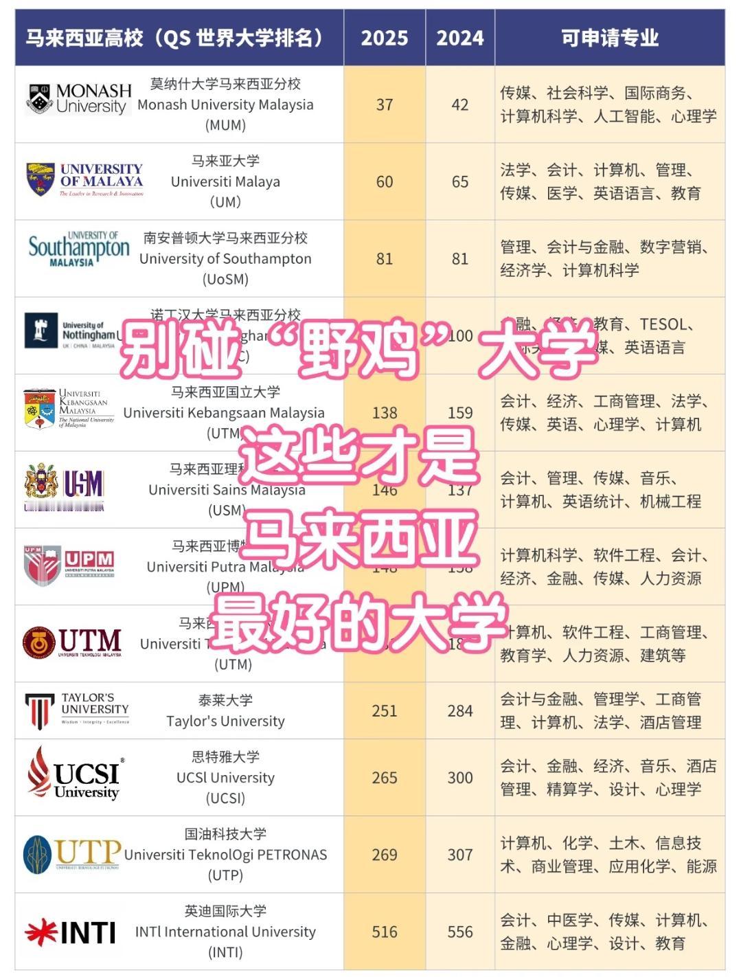 马来西亚高校QS排名解析:留学择校的实力与特色参考 马来西亚的高校近年来在留学市场上热度渐升,2025年QS世界大学排名也新鲜出炉。今天咱们就来聊聊这些马来西亚的高校,看看它们的实力和特色,给有留学意向的同学们一些实际参考。 莫纳什大学马来西亚分校排名37,作为澳洲名校的分校,它的传媒、社会科学、国际商务、计算机科学、人工智能、心理学等专业实力强劲。教学体系和澳洲本部一脉相承,国际化氛围浓厚,学生能享受到优质的教育资源和广阔的国际视野,毕业后无论是留在马来西亚就业,还是前往其他国家发展,都很有竞争力。 马来亚大学排名60,是马来西亚的顶尖公立大学,法学、会计、计算机、管理、传媒、医学、英语语言、教育等专业都很有优势。学校的学术积淀深厚,科研实力在东南亚地区位居前列,医学专业更是其王牌,附属医院的临床资源丰富,适合那些想在医学领域深造的学生。 南安普顿大学马来西亚分校排名81,和英国本部共享资源,管理、会计与金融、数字营销、经济学、计算机科学等专业表现突出。课程设置紧跟行业前沿,比如数字营销专业就很契合当下的互联网商业趋势,学生在这里能学到最实用的专业知识和技能。 马来西亚国立大学排名138,会计、经济、工商管理、法学、传媒、英语、心理学、计算机等专业各具特色。作为马来西亚的公立名校,它的学费相对低廉,教学质量却很高,很适合预算有限但又想接受优质高等教育的学生。 马来西亚理科大学排名146,会计、管理、传媒、音乐、计算机、英语统计、机械工程等专业在东南亚地区认可度不错。学校的工科和传媒类专业实践资源丰富,机械工程专业和当地的制造业企业合作紧密,学生实习和就业机会很多。 马来西亚博特拉大学、马来西亚理工大学、泰莱大学、思特雅大学、国油科技大学、英迪国际大学等院校也都在排名中占据一席之地。博特拉大学的农业和生命科学领域很有特色;理工大学的工科实力强劲;泰莱大学的酒店管理专业享誉东南亚;思特雅大学的艺术和商科专业很受欢迎;国油科技大学在石油化工和工程领域优势明显;英迪国际大学的商科和计算机专业也有着不错的口碑。 马来西亚的高校类型多样,既有世界顶尖名校的分校,也有本土的优质公立和私立大学。选择时,除了参考排名,还要关注专业特色、学费成本、地理位置以及个人的职业规划。毕竟,适合自己的留学选择,才能让自己在异国他乡的求学之路走得更顺畅。 你对马来西亚的高校有哪些了解?你觉得在选择马来西亚高校时,排名和专业特色哪个更重要呢?马来西亚留学生 马来西亚硕士 马来西亚商科 马来西亚前景 马来西亚上学 马来西亚学府区 马来西亚学院