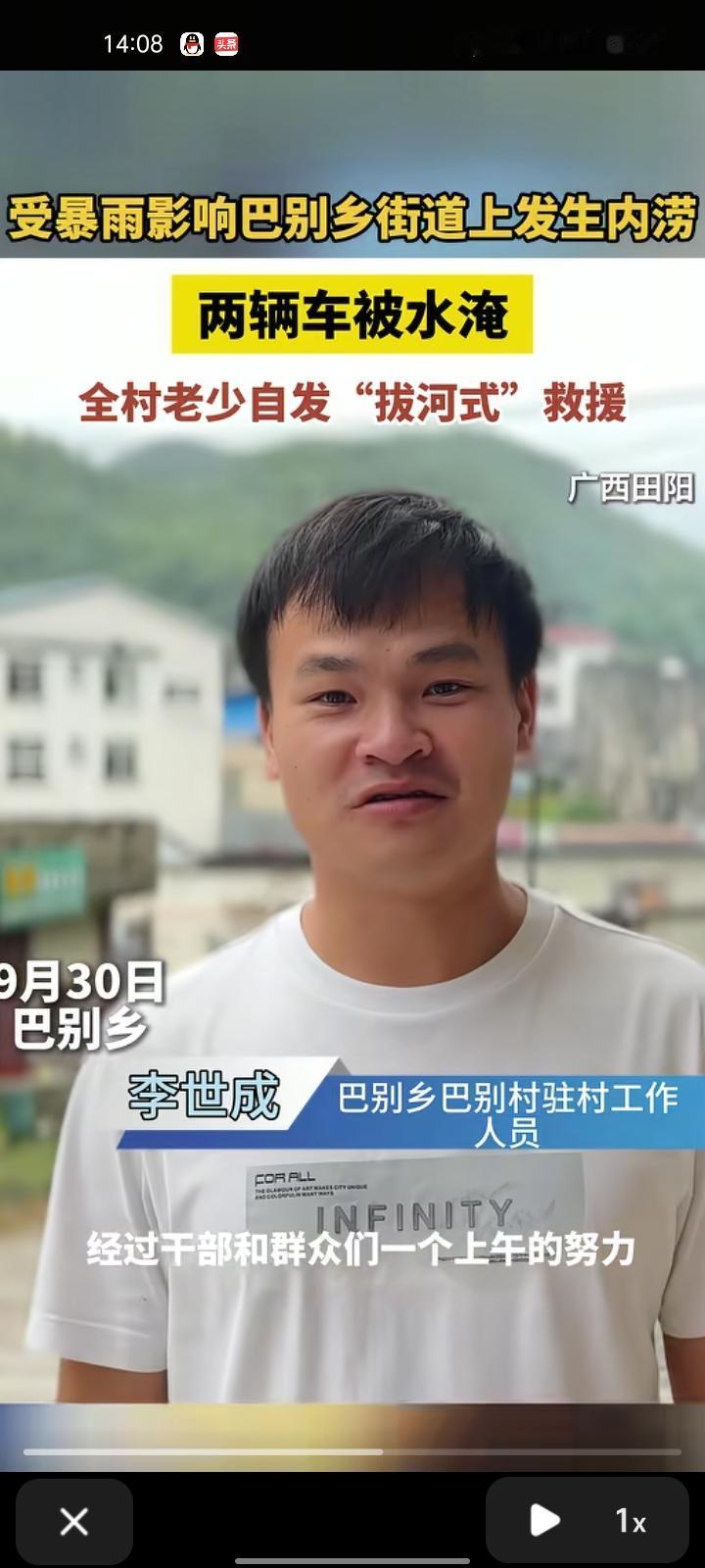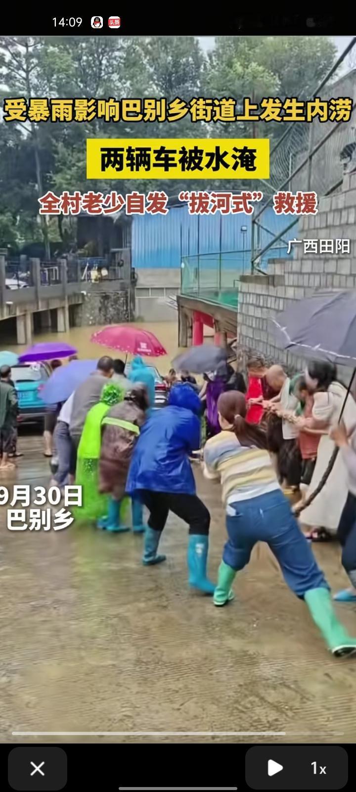 9月30日,百色市田阳县。受暴雨影响导致巴别乡街道内涝,两辆车被淹,全村老少自发“拔河式”救援,大概有二三十人参与。驻村工作人员李世成称,经过干部和群众们一上午的努力,顺利把两辆泡水的车移到安全地带,避免更大的财产损失