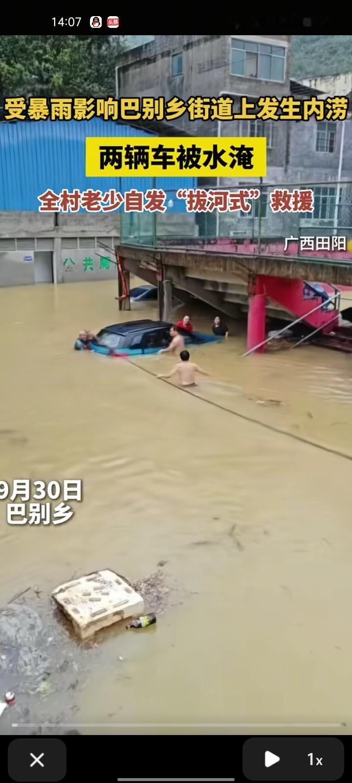 9月30日,百色市田阳县。受暴雨影响导致巴别乡街道内涝,两辆车被淹,全村老少自发