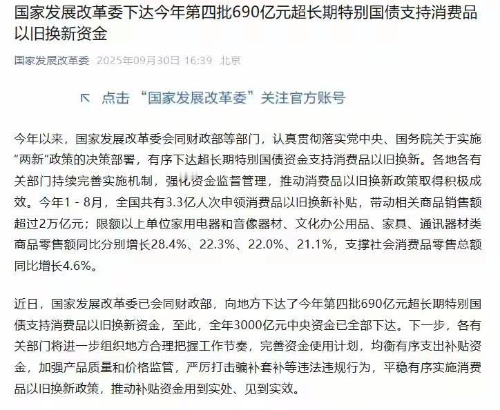 第四批690亿“国补”砸下来了 这哪是简单发补贴 分明是年末消费冲刺的“精准助攻” 还是最后一波大福利。 要知道全年3000亿额度这下全到位了,而且明确说2025年底就截止,2026年不再续期。这次补贴特实在,家电、手机、汽车全涵盖,一级能效家电能补20%,新能源车最高补2万,连适老化改造都有30%补贴。 前几批已经带动了2万亿销售额,大屏电视、AI电脑销量都涨疯了。这次赶在“双十一”前下达,就是让补贴叠优惠,逼着商家让利于民。这波不是盲目撒钱,是既帮消费者省钱,又拉着行业往高端化走。