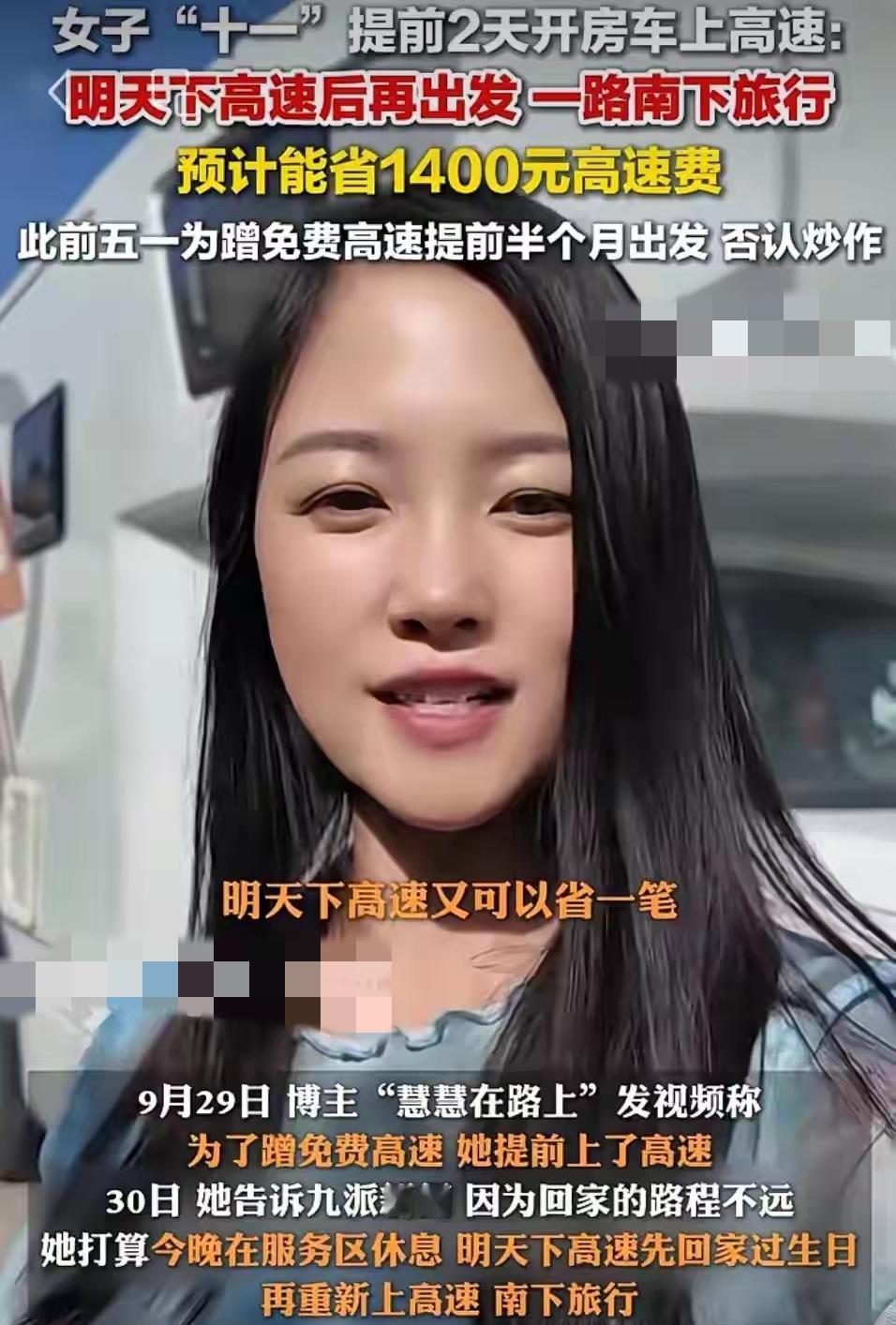 内蒙古女子为省1400元高速费 提前两天赶路还计划再开2000公里五一刚提前半个月蹭过免费 这操作看着会过日子 实则早把账算错了。 都知道高速免费看驶离时间,她就钻这空子,上次3000公里蹭免费,结果油费加服务区花销比高速费还多1000块。这次更折腾,开房车在服务区过夜,吃泡面都吃腻了,还说能错峰。 可谁都算得出隐性账:提前出发的时间要是用来工作,赚的早超省下的钱了。高速免费本是惠民,硬生生被玩成“时间换小钱”的折腾。