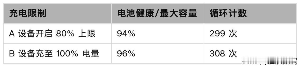 曝光! 使用iPhone15及以上的机主,请留步。iPhone充电限制这个功能的利弊,有人已经通过实验给出答案了,确实有一定的影响,不过开启这个功能可以延长电池寿命这一说法,跟我们想的和官方说的有点出入。 苹果从IOS 18系统中,就开始调整了iPhone15及以后的机型的充电上限功能,就是用户可以根据系统里给定的限制,给iPhone充电设限,当电池被充到设置的电量后,iPhone就停止继续给电池充电。 系统里给定的有五种充电档位:80%、85%、90%、95% 、100% ,随便大家设置,根据苹果官方描述,这项功能有助于延长 iPhone 电池的使用寿命。但说归说,谁都不知道是否真的有用,我知道,大家都是持怀疑态度的,所以我收集到一点信息,就跟大家分享出来了,不过从测试结果来看,大家可能会失望。 数据是我从一个叫Juli Clover 的科技博主的文章里整理出来的,他用的是两台iPhone 16 Pro Max做的测试,从2024年9月开始,也就是去年,现在已经整整有一年,所以他的测试结果还是挺有说服力的,测试的方式也很简单,就是用两台iPhone 16 Pro Max,一台开启充电限制,他设置的是80%,另一台不开启充电限制,然后拿来做对比。这里他也注明,两台设备使用频率是一致的。 结果可以看到,开启限制 80% 充电的 iPhone 16 Pro Max,一年后的电池健康度降到 94%,电池循环计数达到 299 次;而另一台没开启充电限制的iPhone 16 Pro Max,电池健康度为 96%,累计循环 308 次。这就有意思了,开启的居然比不开启的容量少2%?不过循环次数是比不开启的多了9次的,所以看到这个结果是不是有一种上当受骗的感觉的呢?我只能送大家两个字“玄学”。 不过这很有可能跟使用时间有关系,据说,短期内不能直观的反应出来,设备使用在三年以上才会显示出开启充电限制的好处,不知道是真是假。所以大家对这事怎么看?