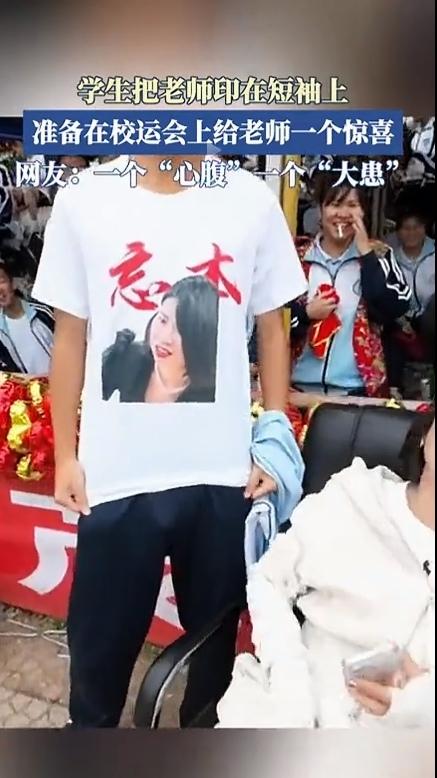 太调皮了!老师肯定对这两位同学太纵容了!他们俩怎么可能敢这么做呢? 运动会上,两名学生真的太调皮了!一看就是跟老师的关系太好了,这两名同学竟然在自己的短袖上印了老师的照片。 一名同学的短袖上,在老师的照片附近写有“忘本”的字样。而另一名同学的短袖上,在老师的照片附近写有“打压”的字样。 这不是赤裸裸地调侃老师吗?既说老师忘本,又说老师打压学生 更过分的是,这两名同学竟然当着各位同学和老师的面,当众调侃自己的老师。引得各位同学哈哈大笑。 网友看到后评论说,这两位同学真的是老师的“左膀右臂”,对老师太好了,老师的影象都被他们“毁了”。 还有的网友说,这两位同学看来就独得老师的恩宠,二十年后,估计这两个小兔崽子还能请这个老师吃饭呢? 两名同学看似是开老师的玩笑,但是,从侧面反应出来这位老师很受同学们的爱戴,不然的话,同学们怎么敢开这种玩笑呢?也说明老师和同学们的关系很和谐也很融洽。 大家觉得呢?欢迎大家评论区讨论留言。