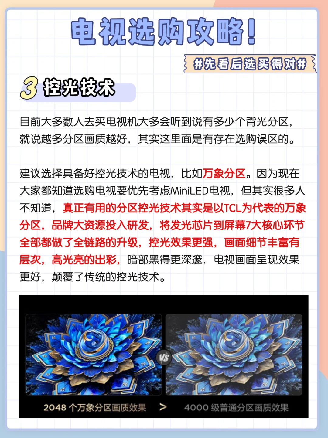 2⃣️控光技术:TCL作为Mini LED宗师,在控光技术上也是下了功夫研究。T7L Ultra 配备万象分区控光技术,这技术可是在国际权威机构 Rtings 的评测中获得了高分认可!不同于普通分区只是在背光数量上堆积,万象分区是从芯片到屏幕等7大环节进行全链路升级,控光效果大幅增强,画质细节更丰富。