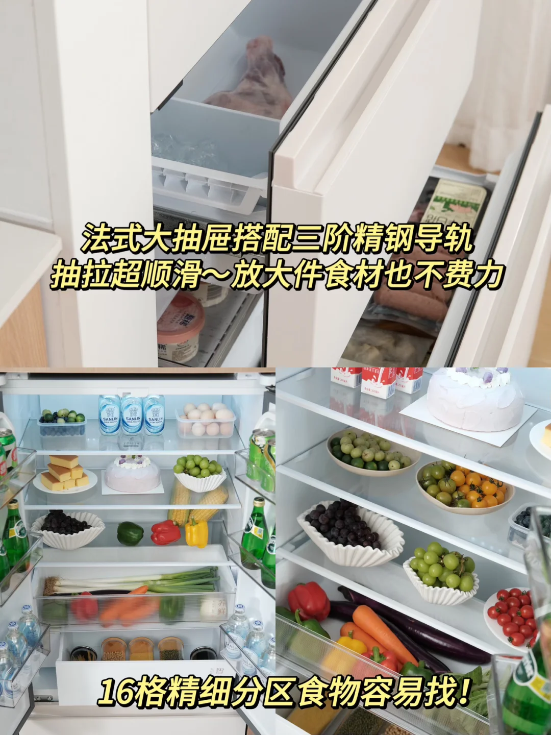 还有法式大抽屉可以整存整取大件食材,像羊腿整个放进去都没问题,三阶精钢导轨的设计抽拉超顺滑。16格精细分区设计把食材分类收纳得明明白白,打开冰箱一目了然~