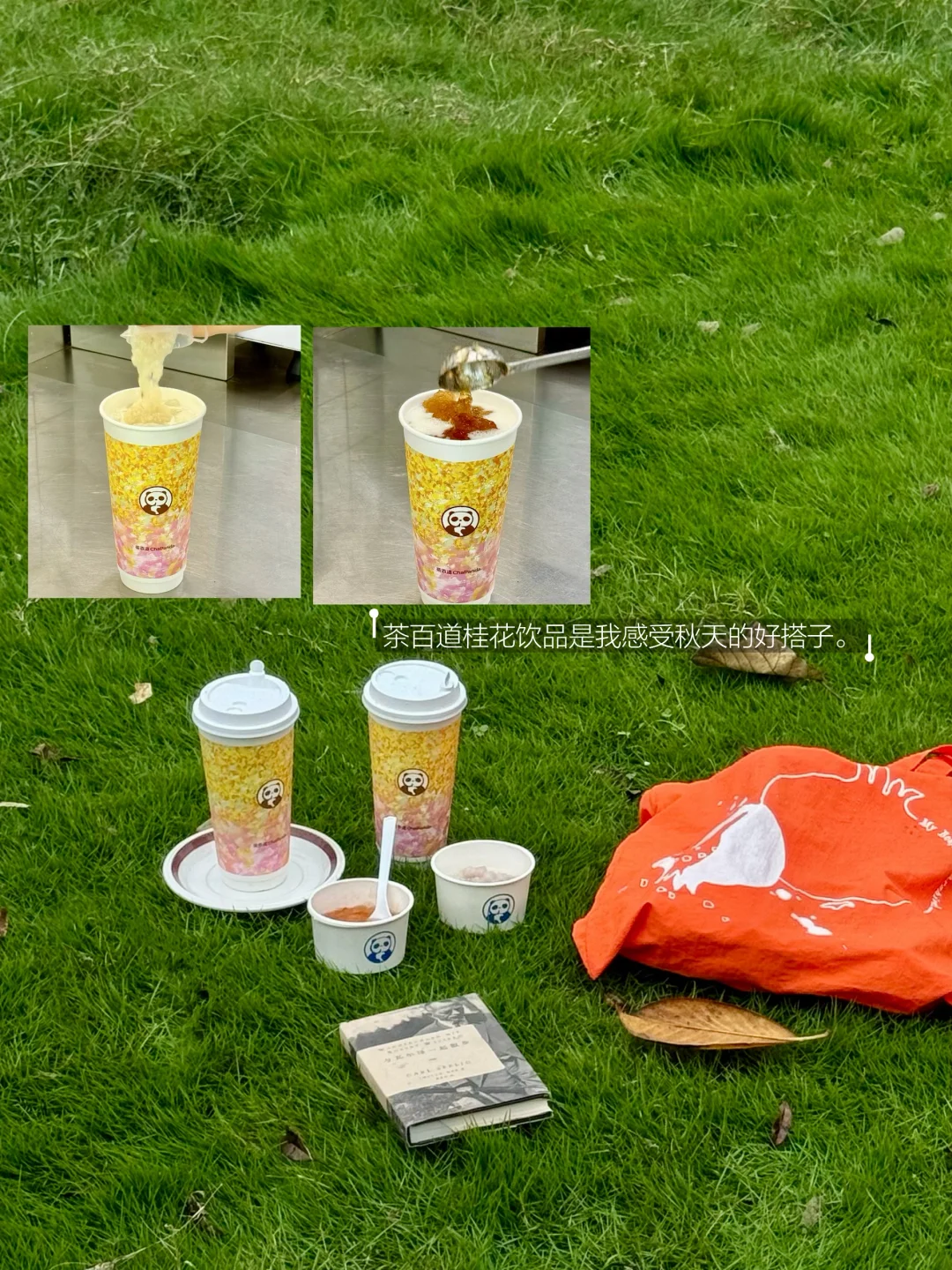 拿着茶饮踩着落叶散步,闻着桂花香。