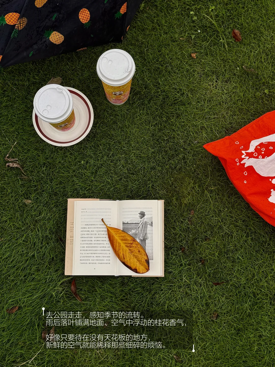 去公园走走,感知季节的流转。雨后落叶铺满地面、空气中浮动的桂花香气,好像只要待在没有天花板的地方,新鲜的空气就能稀释那些细碎的烦恼。