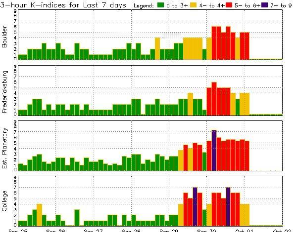 【地磁扰动达到中等地磁暴水平】 【极光事件】 ++++++++++ !![蓝]色警报!! ++++++++++ 北京时间2025年10月1日12时19分,地磁扰动达到中等地磁暴水平,为KP=6,需等待3小时平均值的监测结果,留意中纬度出现极光的可能性。 数据 发布时间:2025年10月01日12时37分04秒