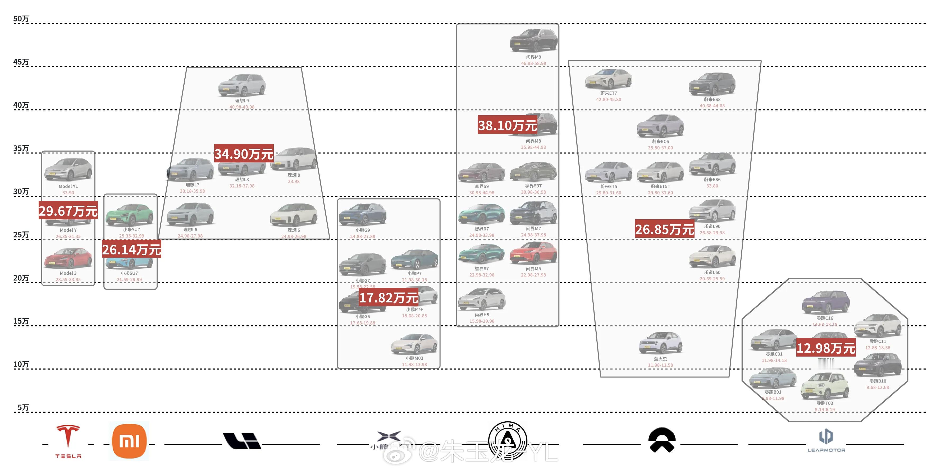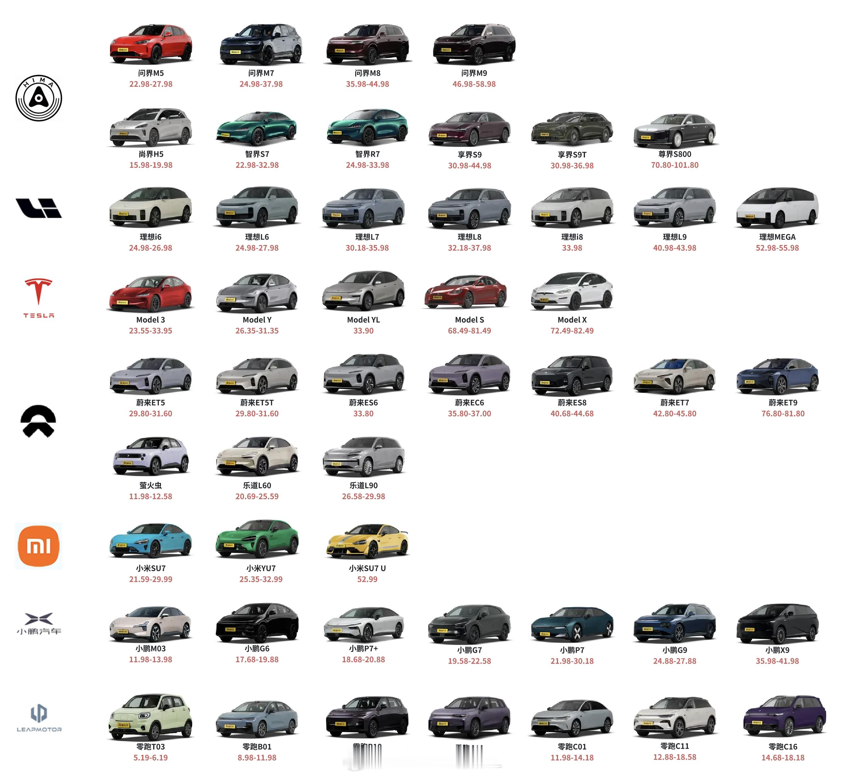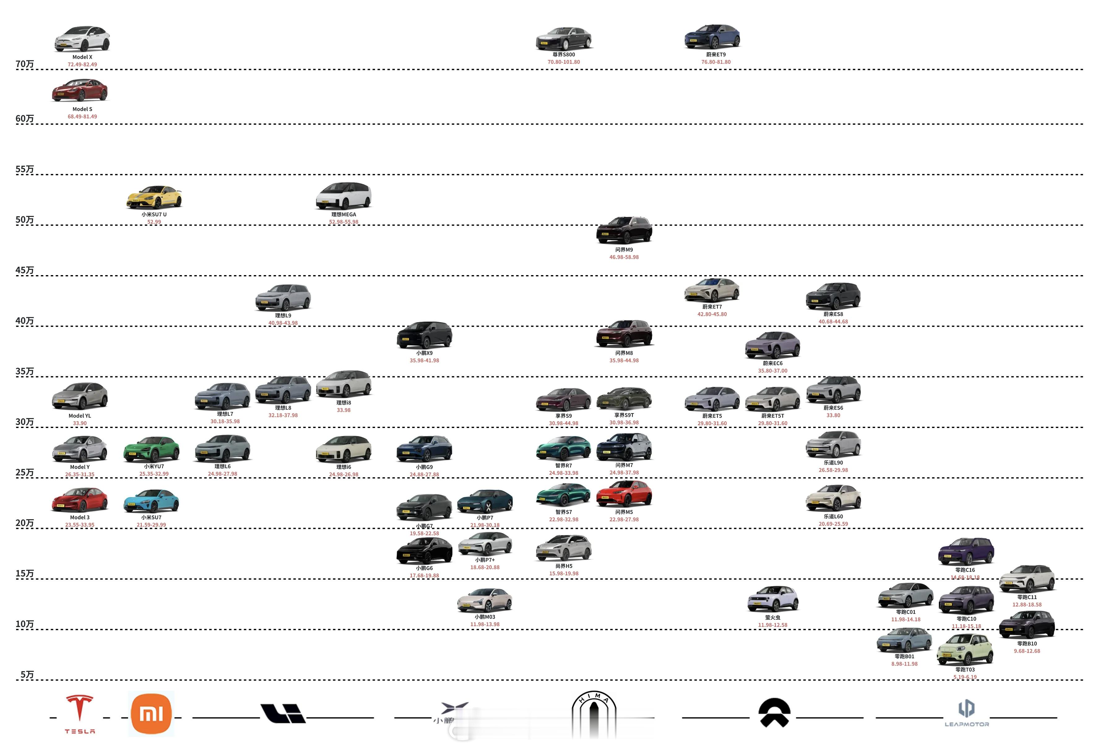晚点做了一个可供参考的平均售价(8月的):零跑 12.98 万元;小鹏 17.82 万元;小米 26.14 万元;蔚来 26.85 万元;特斯拉 29.67 万元;理想 34.90 万元;鸿蒙智行 38.10 万元