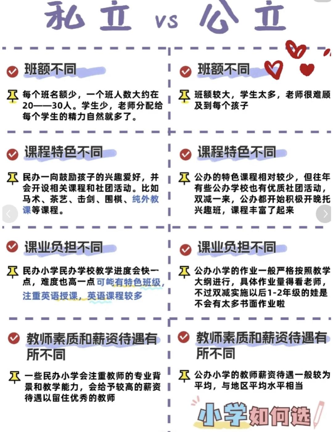 私立vs公立小学:择校时的真实差异与理性选择 孩子上小学,选私立还是公立,是很多家长纠结的问题。其实两者在班额、课程、课业、师资等方面差异明显,今天就来聊聊这些差异,帮家长们更清晰地做出选择。 班额方面,私立小学每个班通常20-30人,学生少,老师能给每个孩子分配更多精力,关注更细致。而公立小学班额较大,老师很难顾及到每个孩子,孩子得到的个性化关注相对少一些。这一点对需要更多关注和引导的孩子来说,影响还是挺明显的。 课程特色上,私立小学鼓励孩子的兴趣爱好,会开设不少特色课程和社团活动,像马术、茶艺、击剑、围棋、纯外教课等都很常见,能让孩子在兴趣拓展上有更多尝试。公立小学的特色课程相对少一些,但“双减”之后,很多公立学校也积极开展晚托兴趣班,课程丰富了不少,而且公立学校的社团活动也有不少优质的,比如科技社团、艺术社团等。 课业负担的区别也不小,私立小学教学进度会快一点,难度也高一点,还有特色班级,注重英语授课,英语课程较多。公立小学的作业一般严格按照教学大纲进行,“双减”后1-2年级基本没有太多书面作业,孩子的课业压力相对小一些,有更多时间可以自由支配。 教师素质和薪资待遇方面,一些私立小学注重教师的专业背景和教学能力,会给予较高的薪资待遇以留住优秀的教师。公立小学的教师薪资待遇一般较为平均,与地区平均水平相当,教师队伍相对稳定。 选择私立还是公立小学,没有绝对的好坏,只有是否适合自己的孩子和家庭。如果家庭经济条件允许,孩子需要更多个性化关注和兴趣拓展,私立小学是个不错的选择;如果更看重孩子的课业压力和学校的稳定性,公立小学也是很务实的选择。 你对私立和公立小学的差异有哪些看法?你觉得在给孩子选择小学时,哪些因素是最需要考虑的呢?私立教育成本 小升初择校升学 私立学校 小升初择校政策 小升初择校 私立初中 私立学校待遇