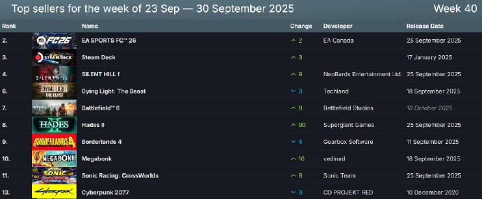 本周的榜首游戏是《EASPORTSFC26》,同时《寂静岭f》表现优异,位于榜单第三名。《消逝的光芒:困兽》《战地风云6》《黑帝斯2》等作品也在榜单中,整体上没有太大变化。