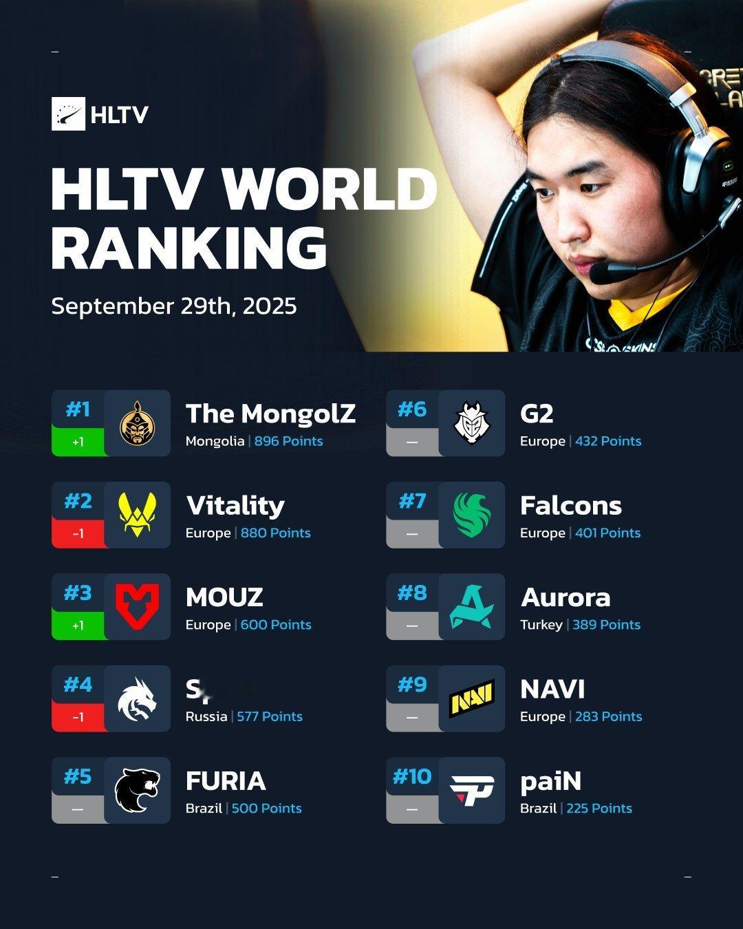 亚洲之光!The MongolZ登顶HLTV世界排名榜首!,这可是亚洲CS有史以来首次登顶榜首,这支蒙古战队今年随着在BLAST.tv奥斯汀Major闯入决赛,他们成功冲进前三,后续因斩获EWC电竞世界杯首座大型赛事冠军,且Vitality秋季赛季后的表现挣扎,The MongolZ顺利超越小蜜蜂登顶HLTV世界排名榜首!