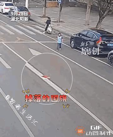 湖北,一个小女孩放学过马路回家时,发现路中间有一面国旗,她毫不犹豫,不顾个人安危