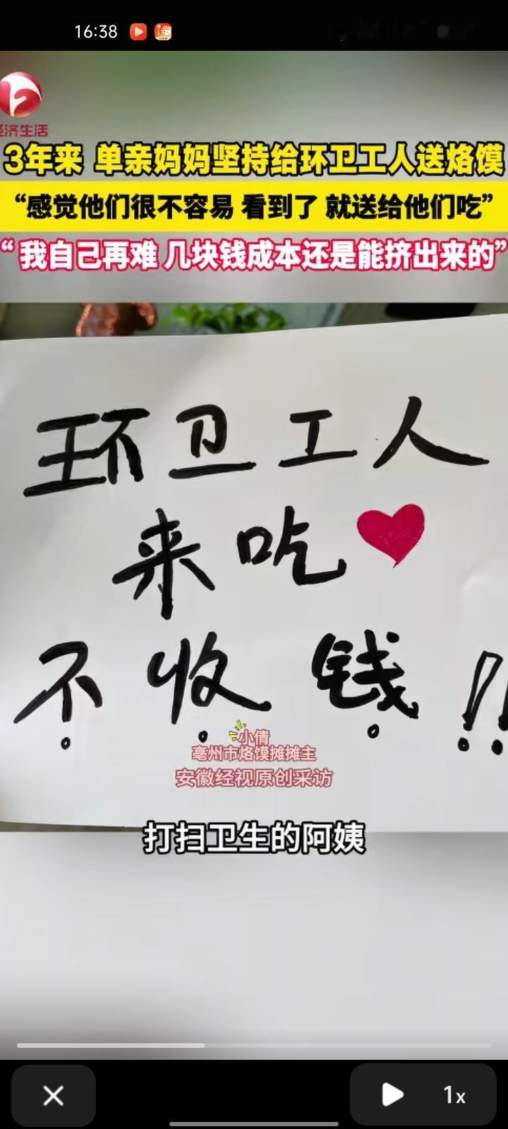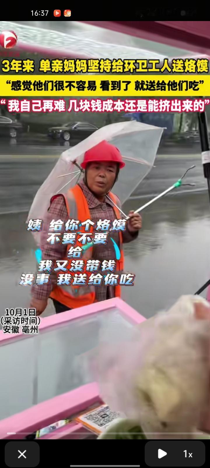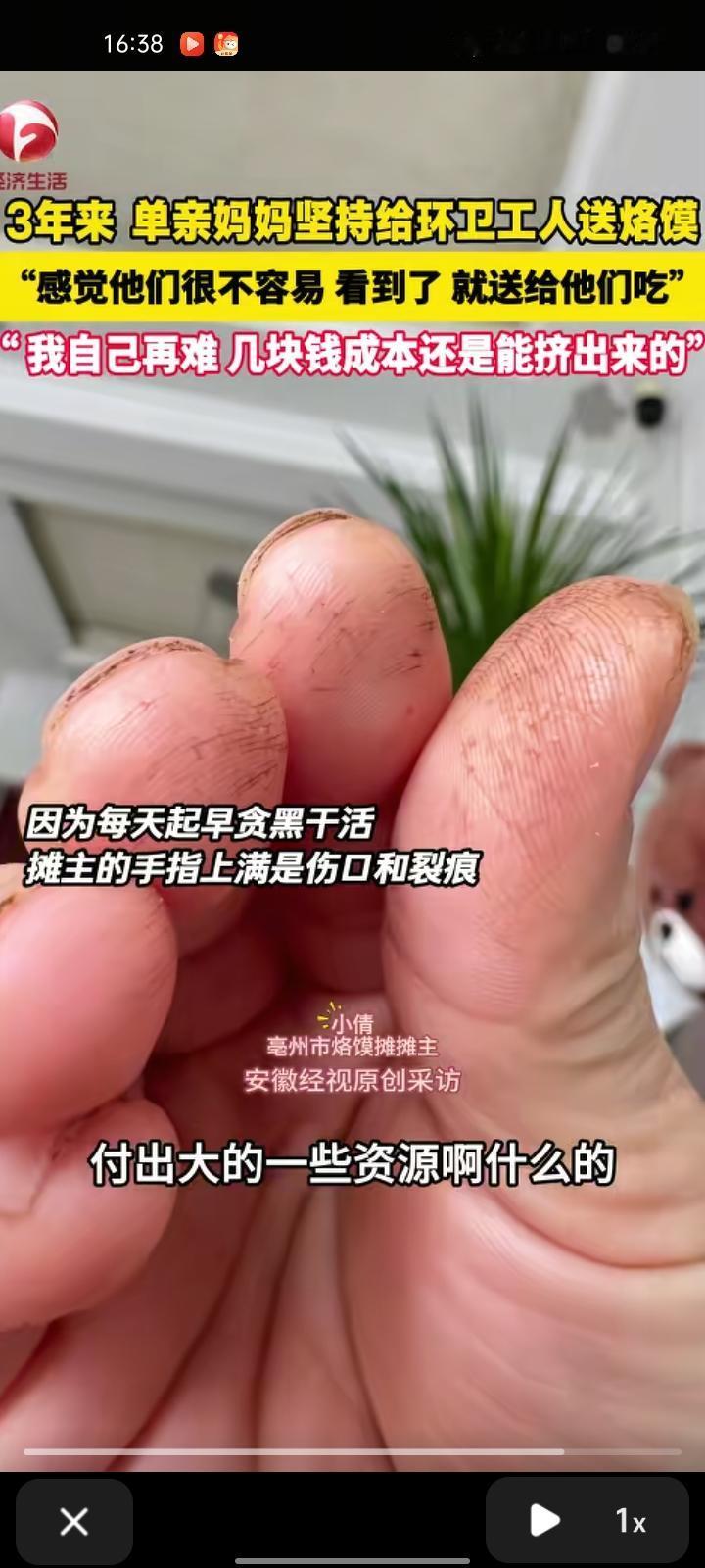 9月27日,安徽亳州。单亲妈妈看着环卫工人不容易,不舍得吃也不舍得喝,坚持给环卫工人送烙馍,已坚持三年。每天起早贪黑的干活,她的手指满是裂痕和伤口,虽然辛苦但帮助别人也值得。她表示,自己再难,几块钱的成本还是能挤出来的。