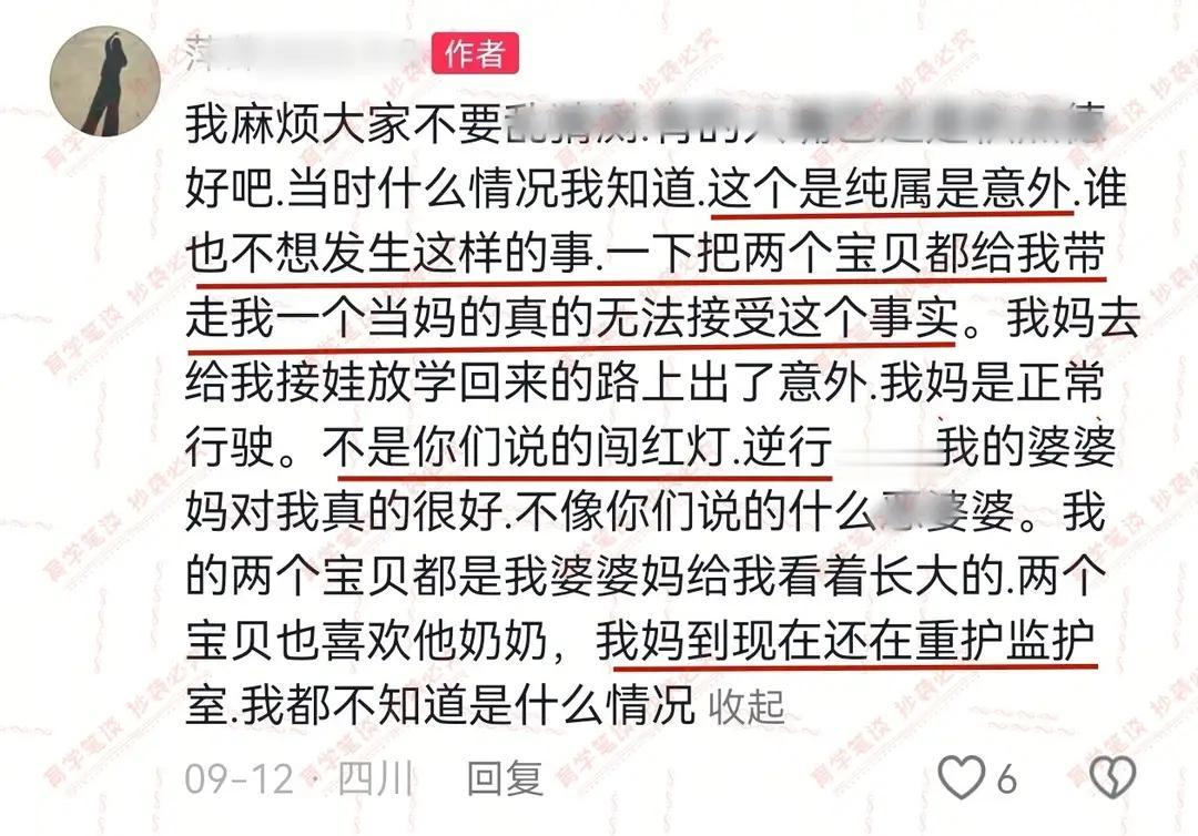 今天刷到四川那位妈妈的悼念文,7岁刚入学的哥哥,5岁刚入园的弟弟,8月底才搬了新家,一家人正盼着好日子,没想到9月8日外婆接放学时在石马坡 红绿灯处遭遇车祸,两个孩子没了,外婆还在ICU 妈妈说不是外婆闯红灯或逆行 就是场意外 字里行间全是自责 作为妈妈真的太懂这种痛了 道路交通伤害本就是儿童伤害的主要死因 这事儿给我敲了警钟 连夜就去给孩子选了安全座椅 这真的是能护娃一命的事 愿两个小天使安息也希望这位妈妈能撑过去 老人骑车反应能力差,我们这有一个老人开着老头乐带着老伴加两个孩子一头栽沟里去了,后果很严重 看见过一个七八十岁的老人拄着拐杖半天走一步去接孙子放学 可惜了,可惜了 这么小的俩小孩意外同时丧生 对孩子父母打击太大了 不论干啥要把人身安全放在第一位